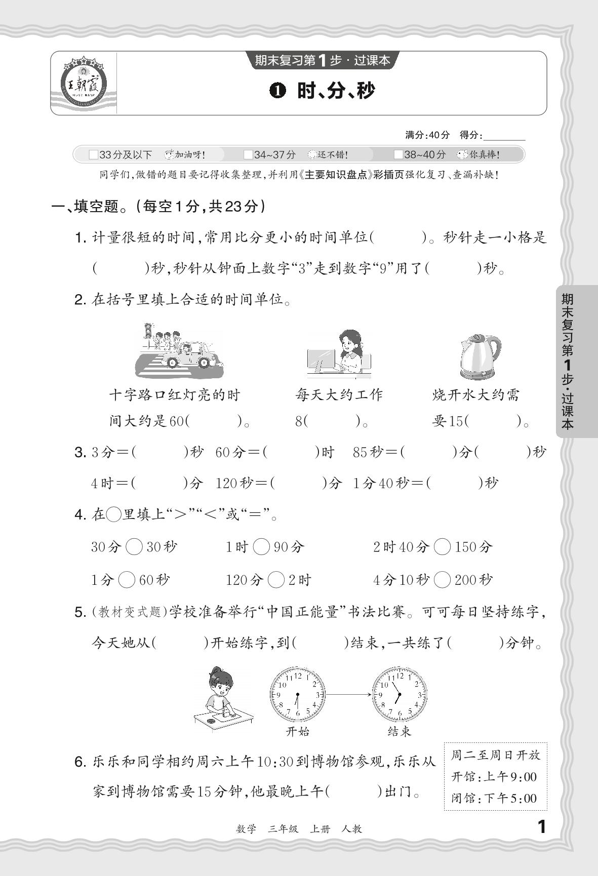 2023秋上册三年级数学人教版 期末过课本QMB版·时、分、秒【1】