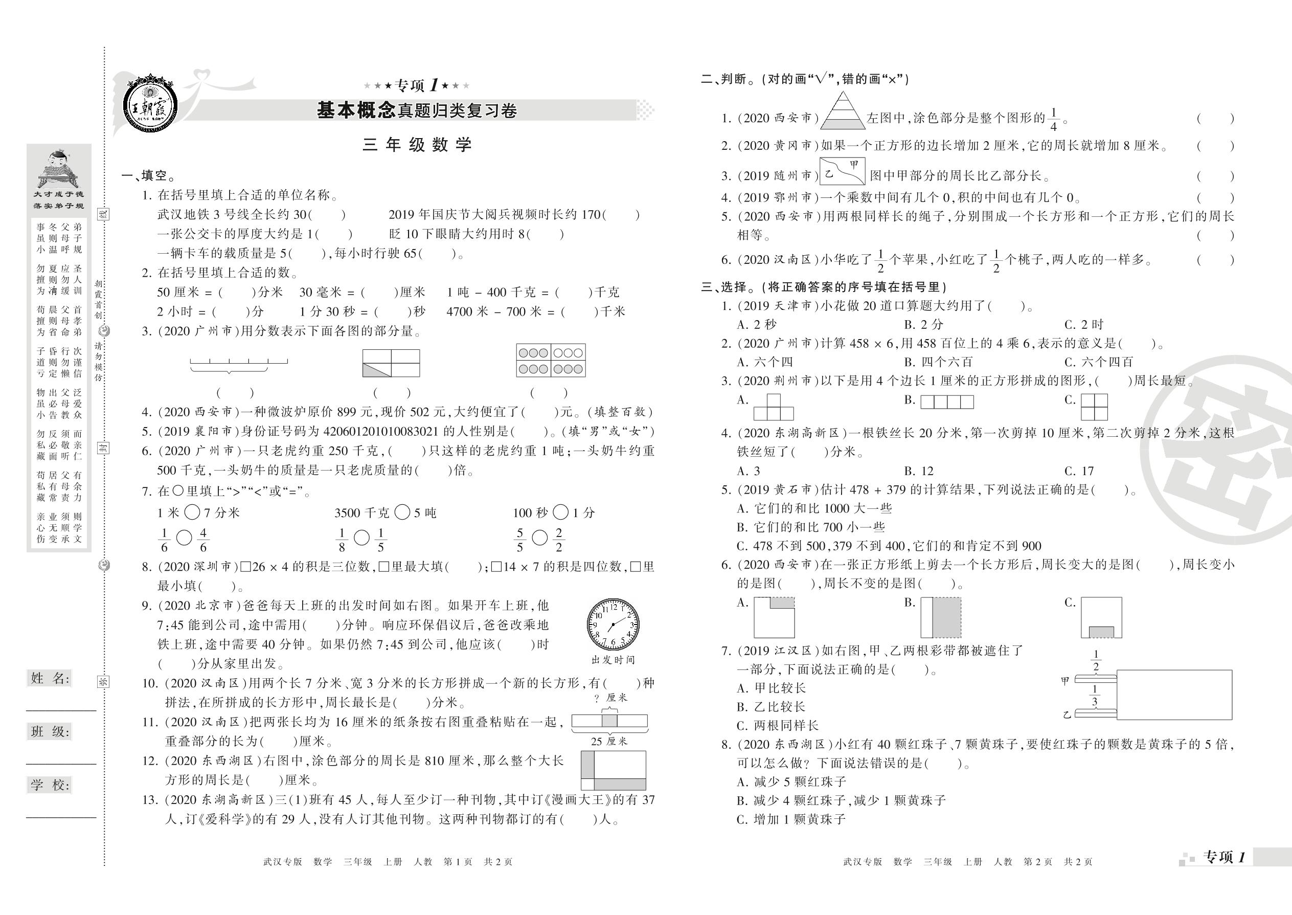 王朝霞期末专项卷——基本概念、计算真题归类复习三年级上册数学(人教版)_R21080490520【0】