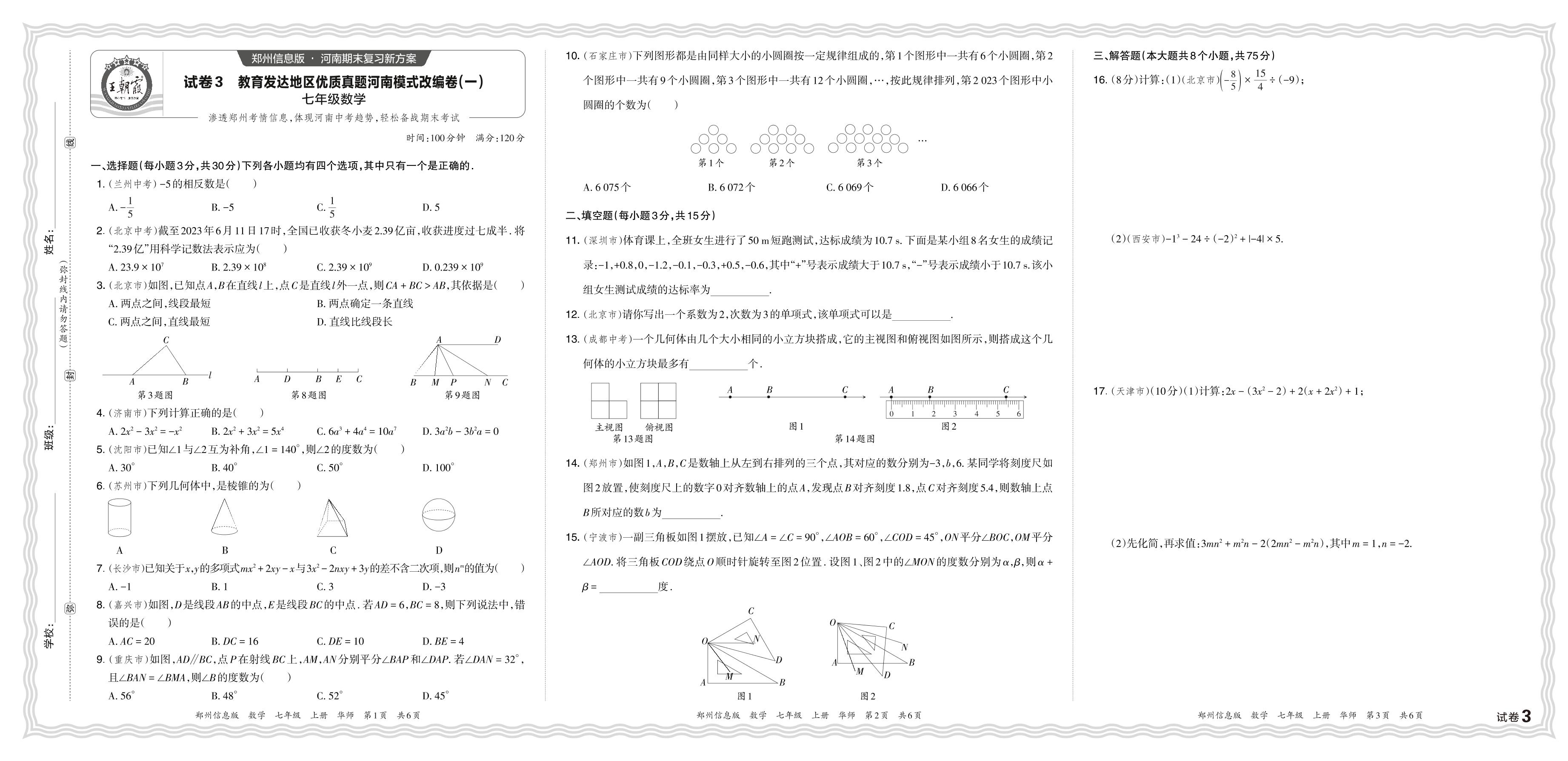 2023年秋教育发达地区优质真题河南模式改编卷(一)七年级上册期末数学(华师版)【3】