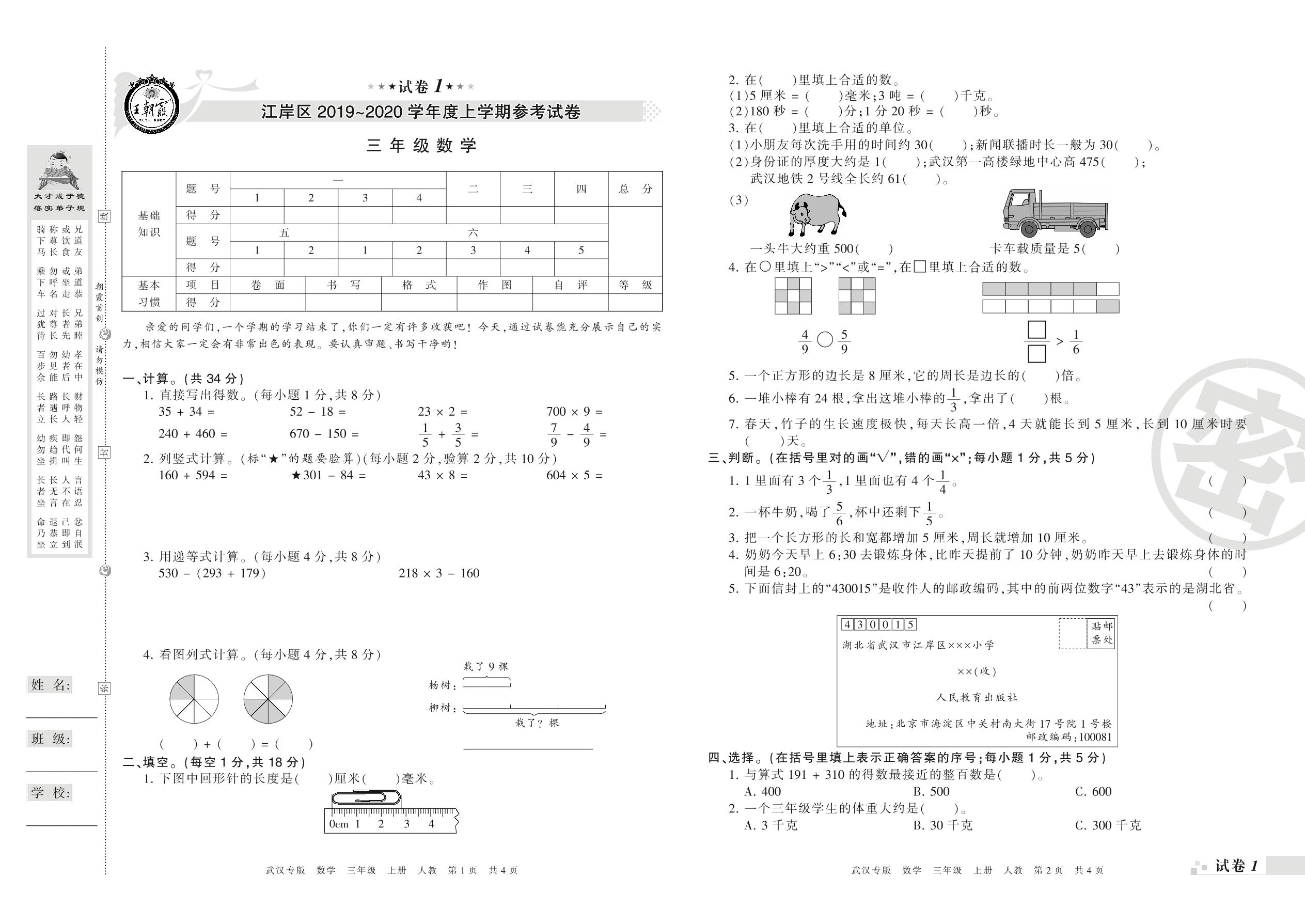 2019-2020学年第一学期武汉市江岸区三年级数学试卷(人教版)【1】