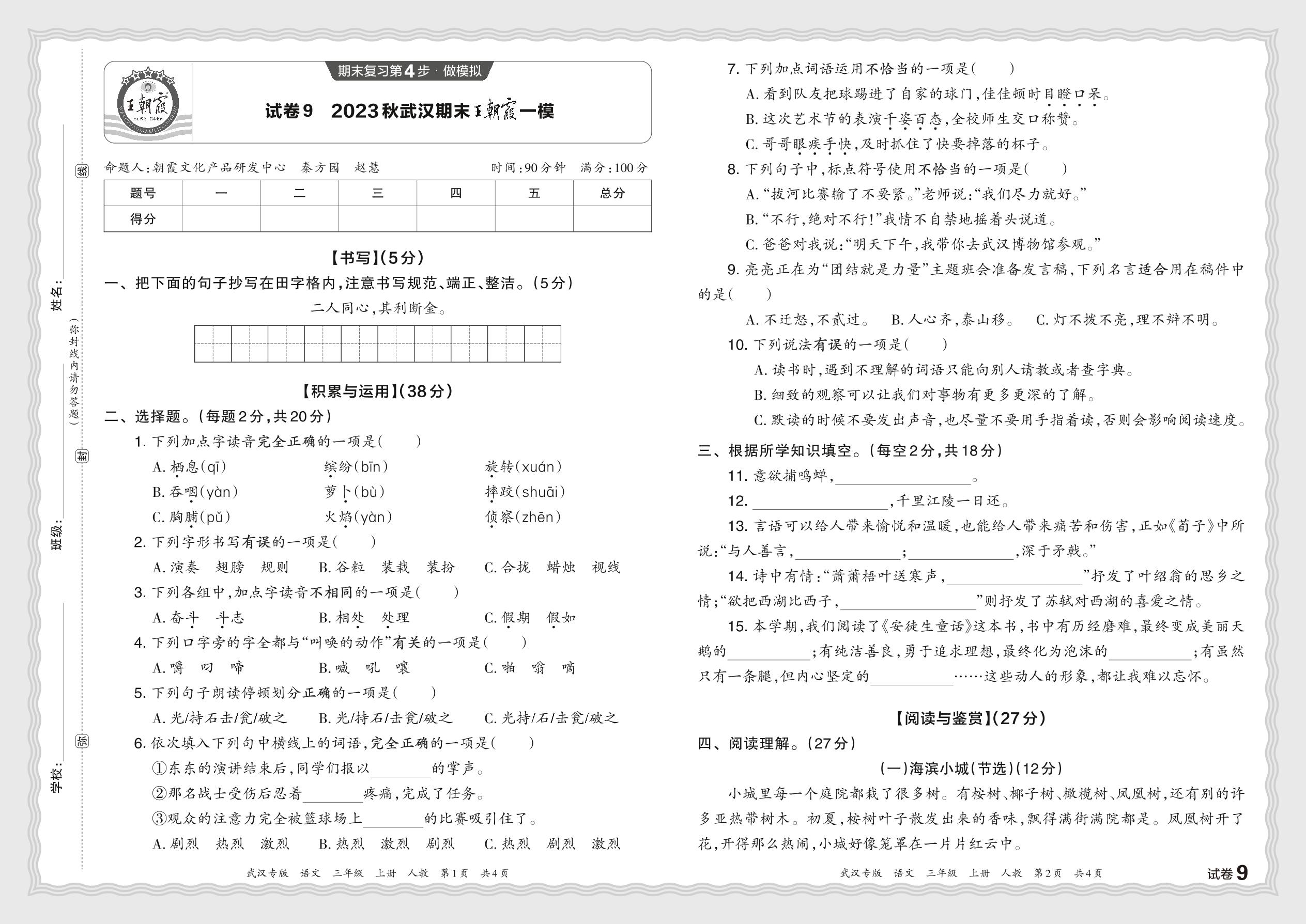 2023秋上册三年级语文人教版 湖北武汉期末王朝霞一模