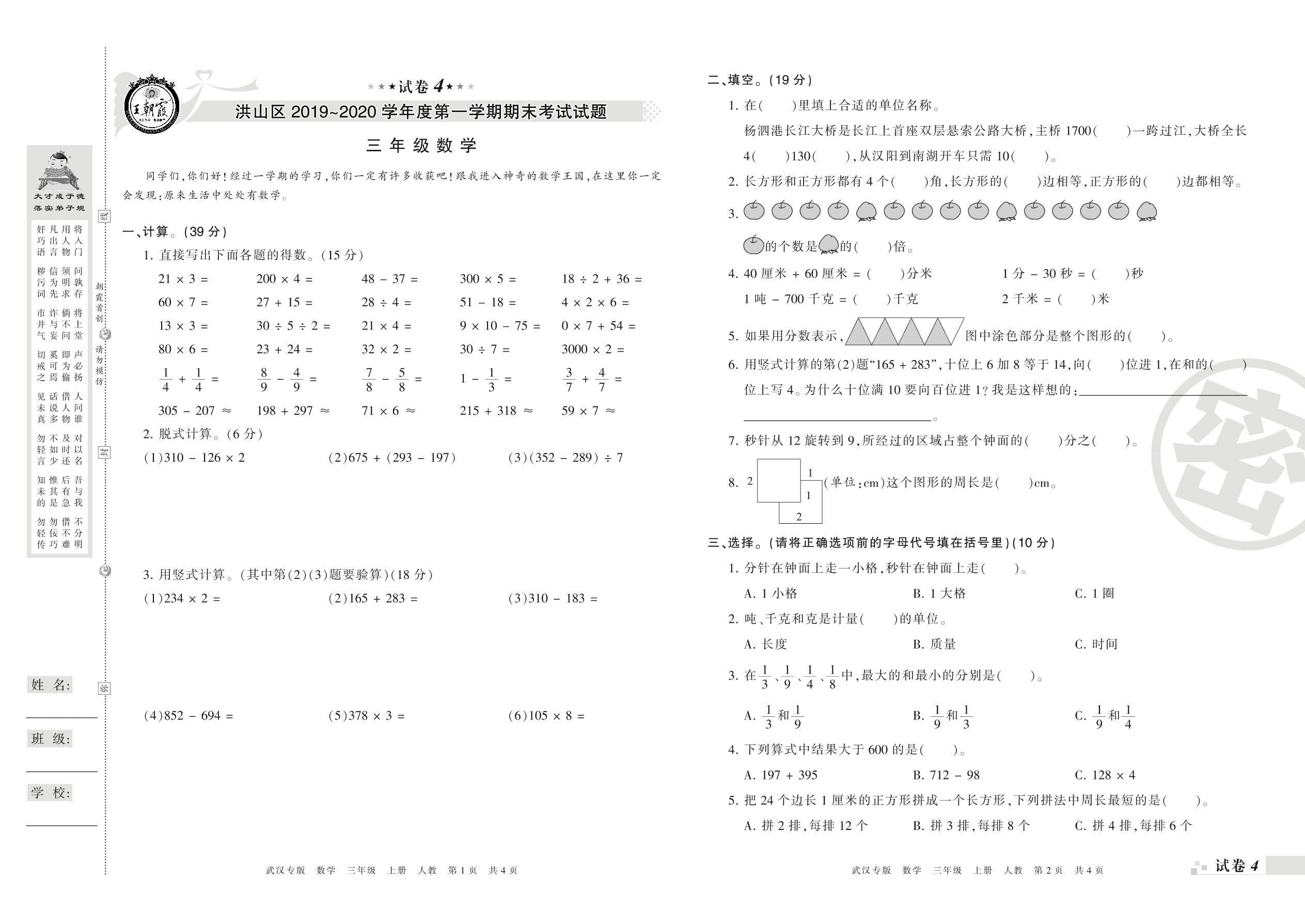 2019-2020学年第一学期武汉市洪山区三年级数学试卷(人教版)【4】