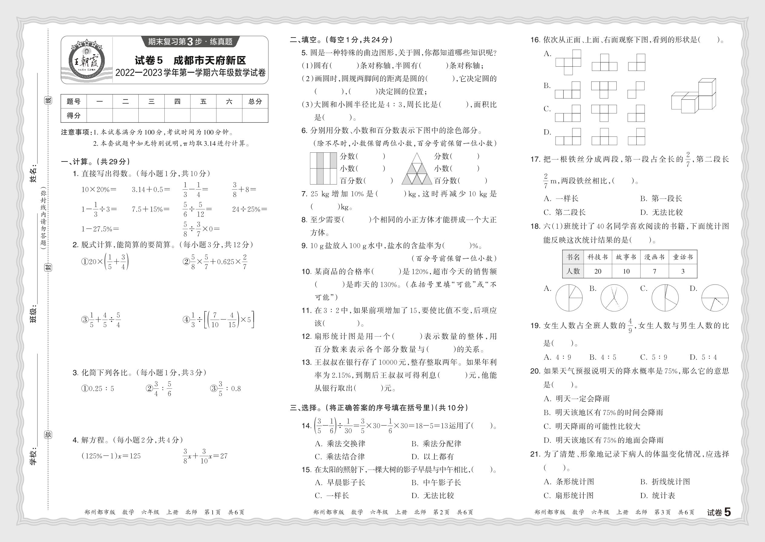 四川省成都市天府新区2022—2023学年第一学期六年级数学期末试卷(北师版)【5】