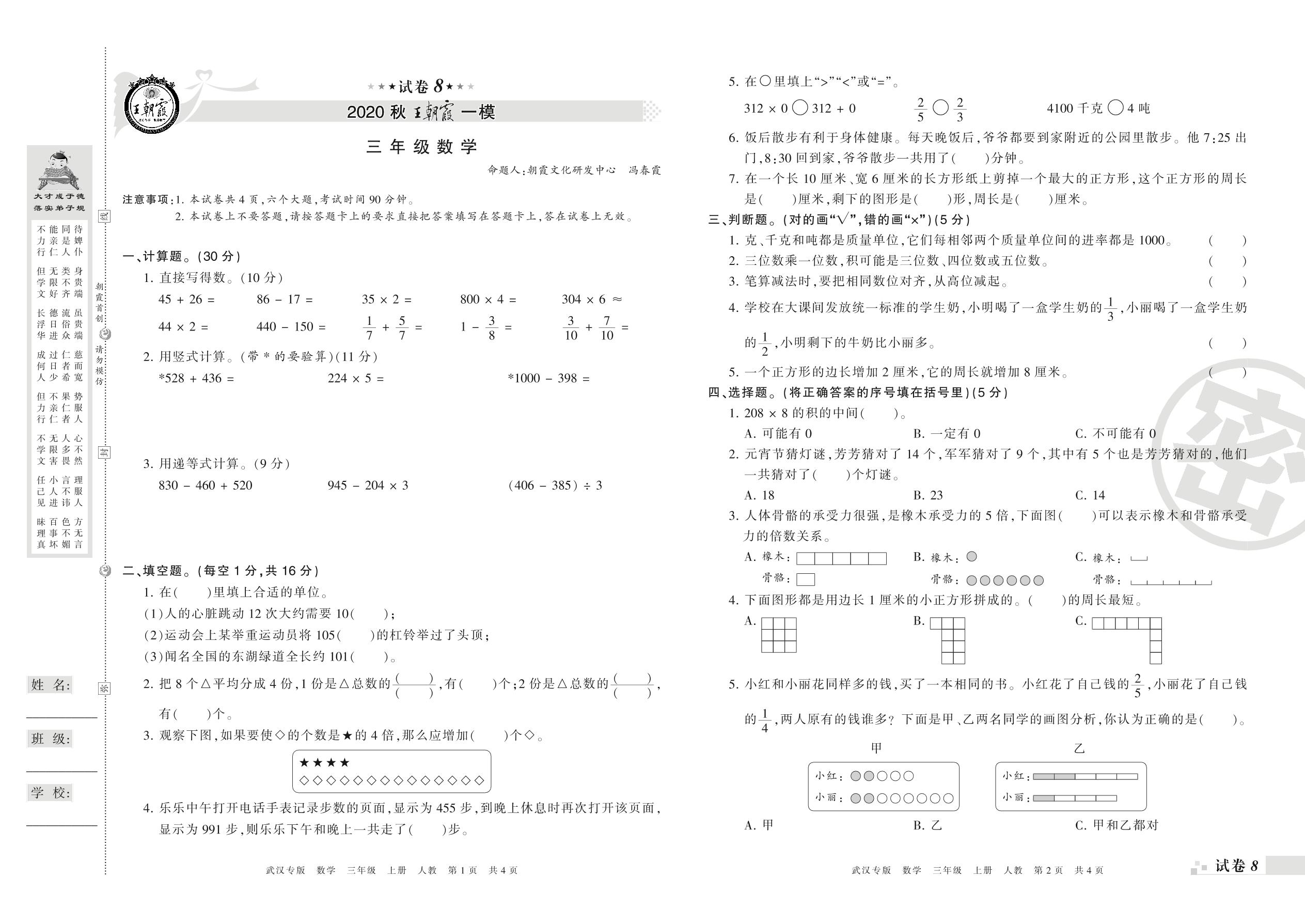王朝霞期末模拟卷三年级上册数学(人教版)_R21080490603【8】