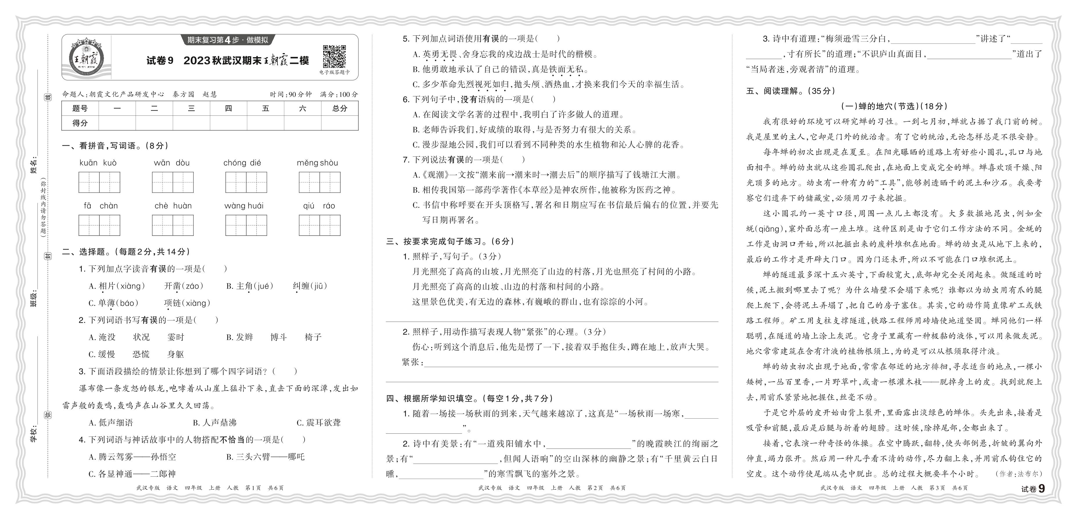 2023秋上册四年级语文人教版 湖北武汉期末王朝霞二模