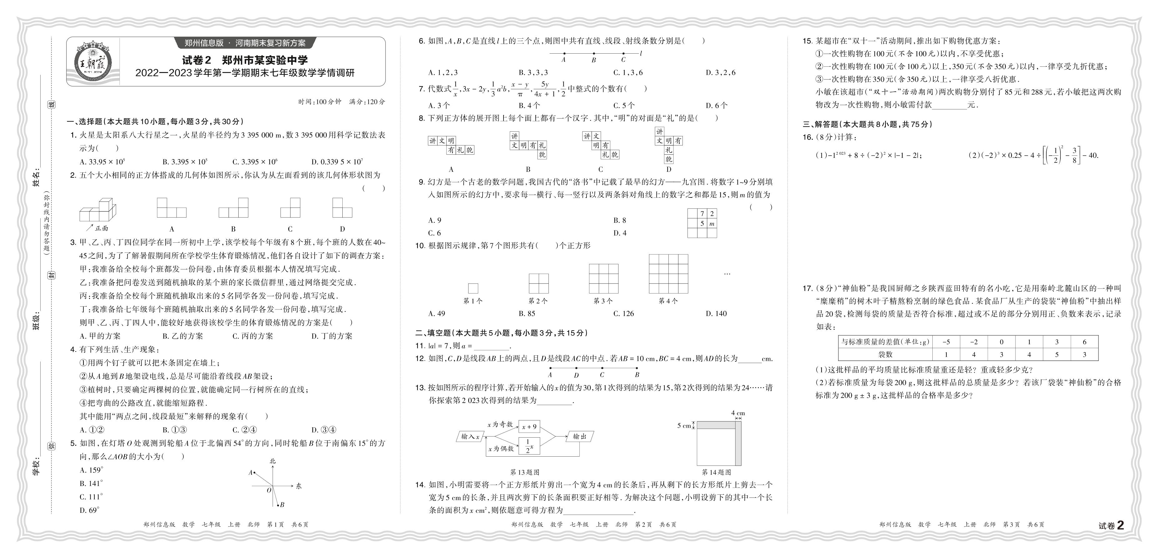 河南省郑州市某实验中学2022—2023学年第一学期期末七年级数学学情调研(北师版)_R231128103519156【2】