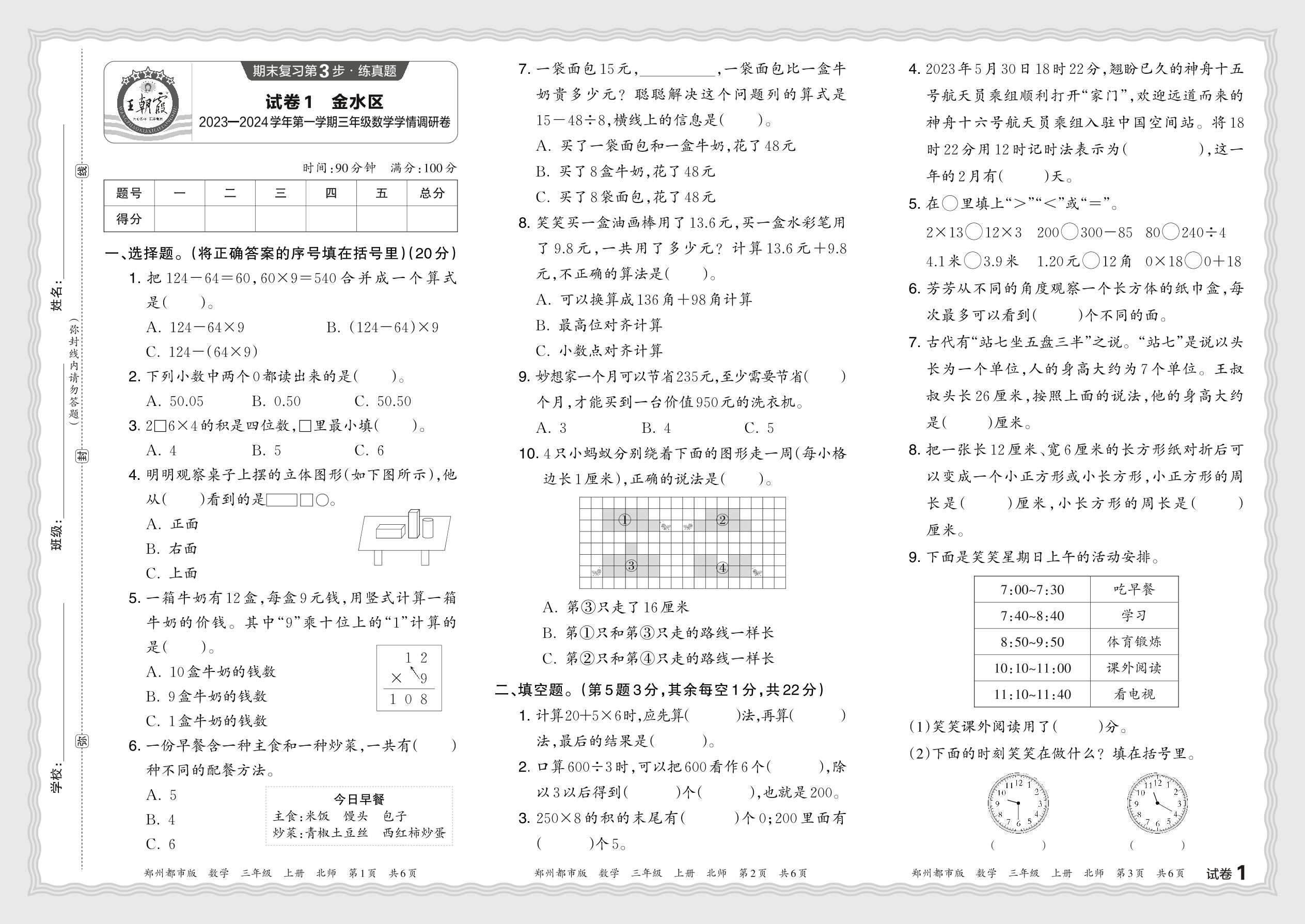 河南省郑州市金水区某重点小学2023—2024学年第一学期小学三年级数学学情调研卷(北师版)【1】