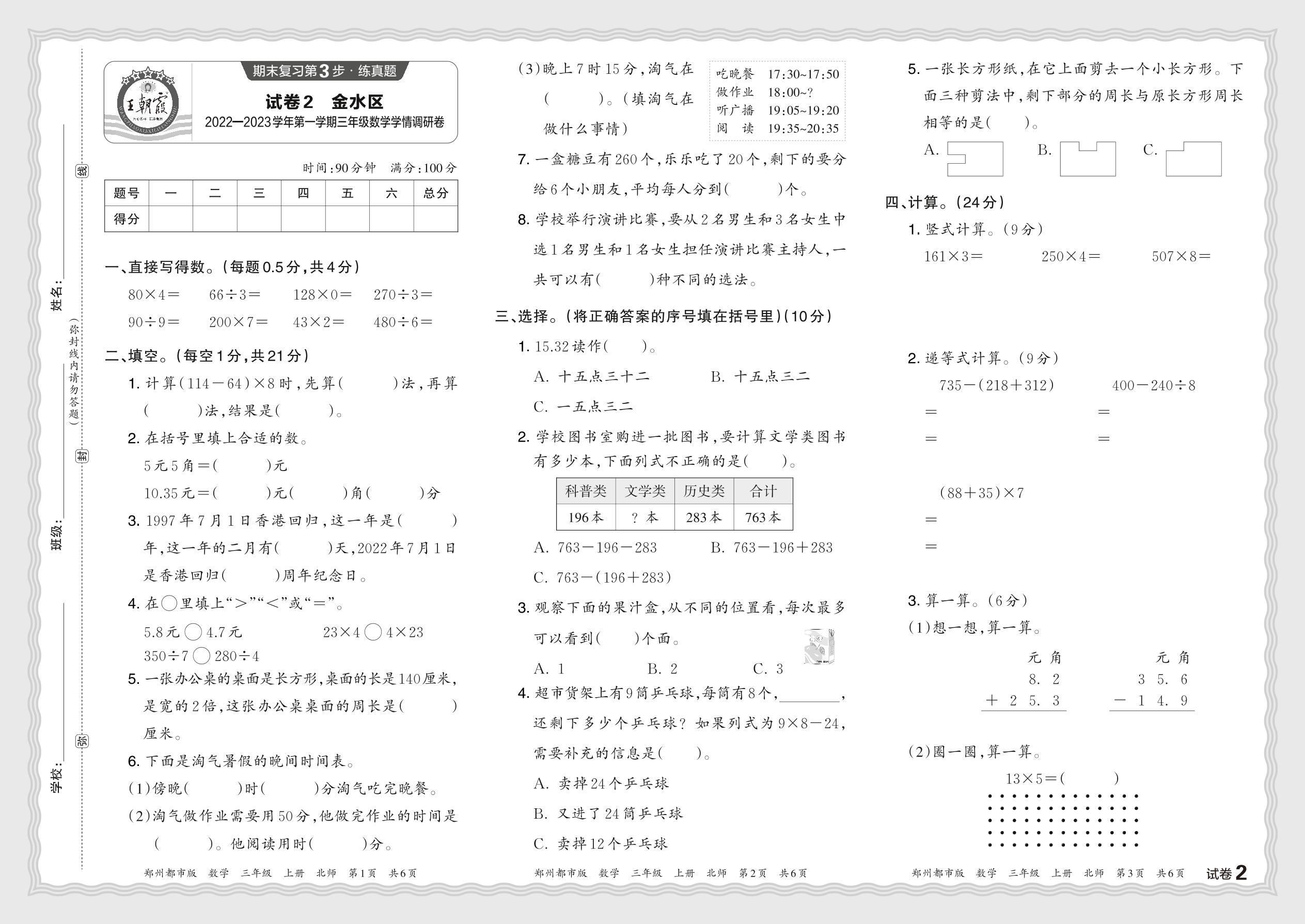 河南省郑州市金水区2022—2023学年第一学期三年级数学学情调研卷(北师版)【2】