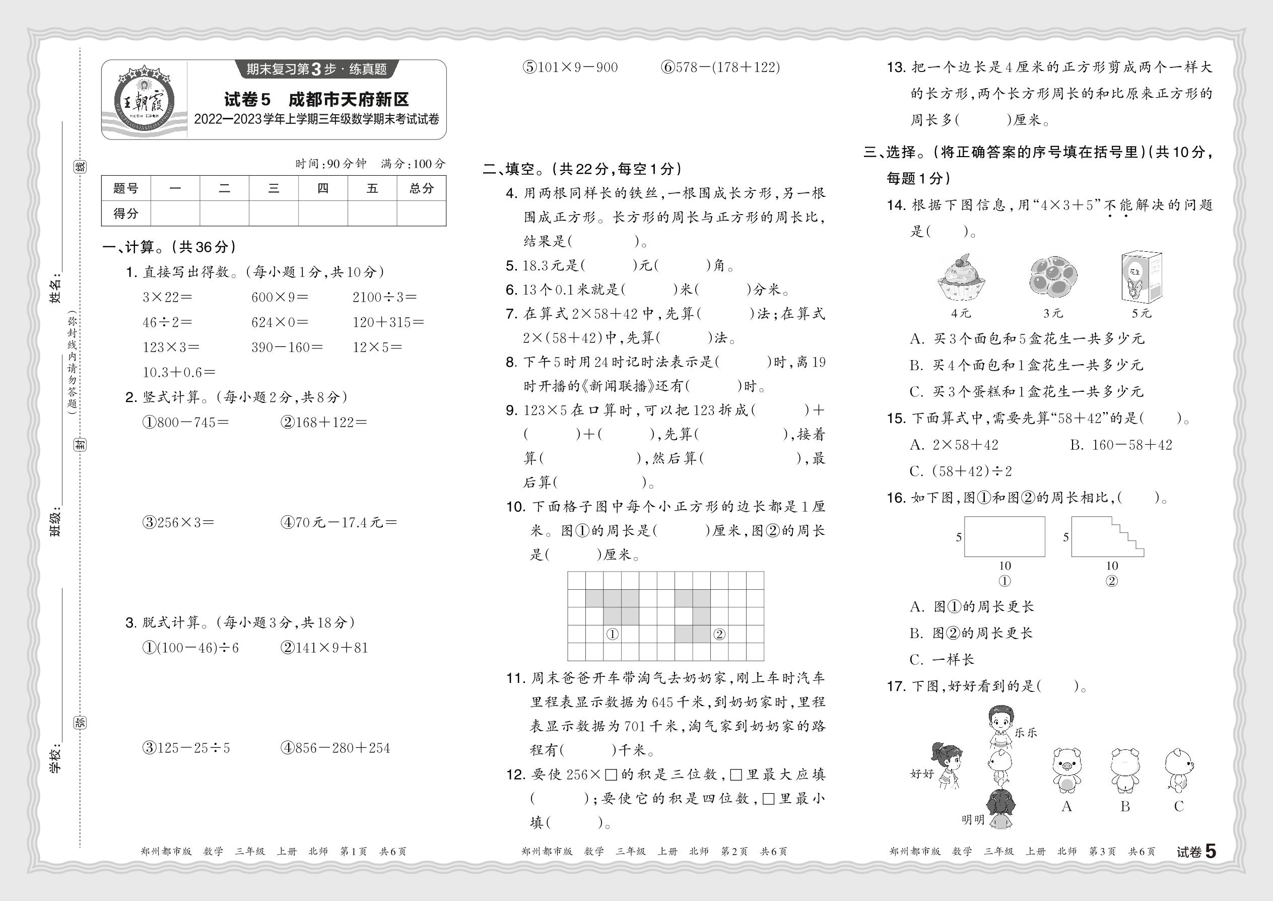 四川省成都市天府新区2022—2023学年第一学期三年级数学期末考试试卷(北师版)【5】