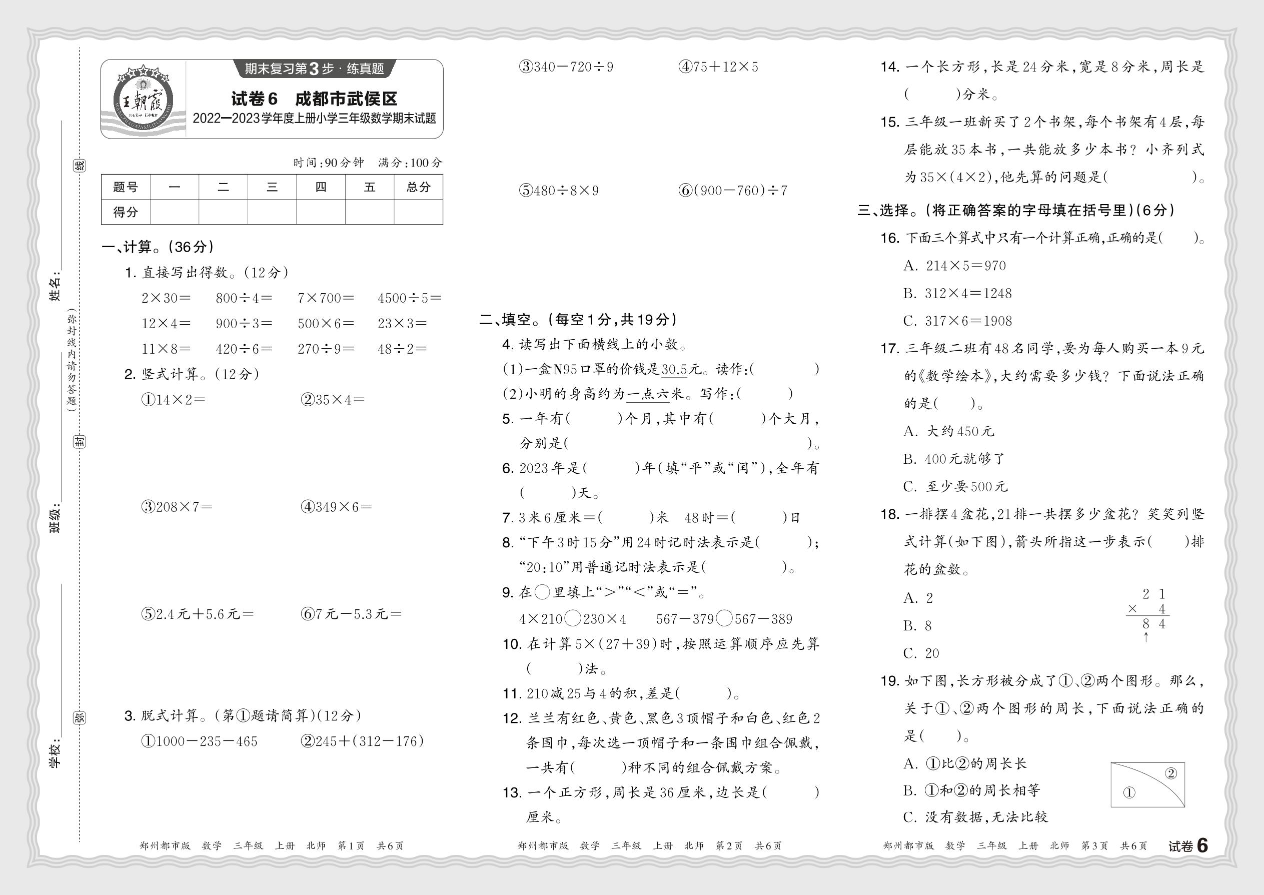 四川省成都市成华区2022—2023学年第一学期三年级数学期末试题(北师版)【6】