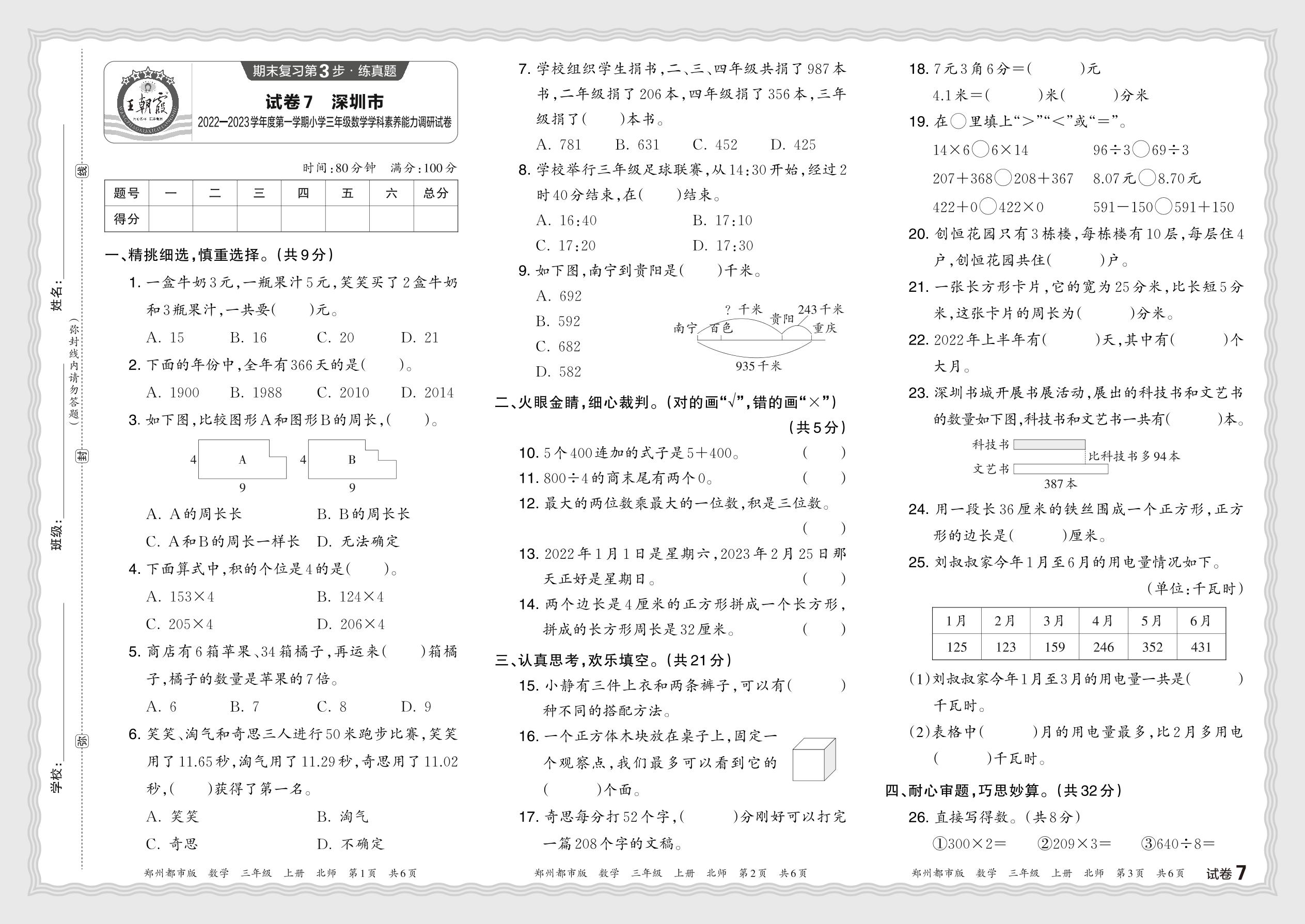 深圳市2022—2023学年第一学期三年级数学期末学科素养能力调研试卷(北师版)【7】