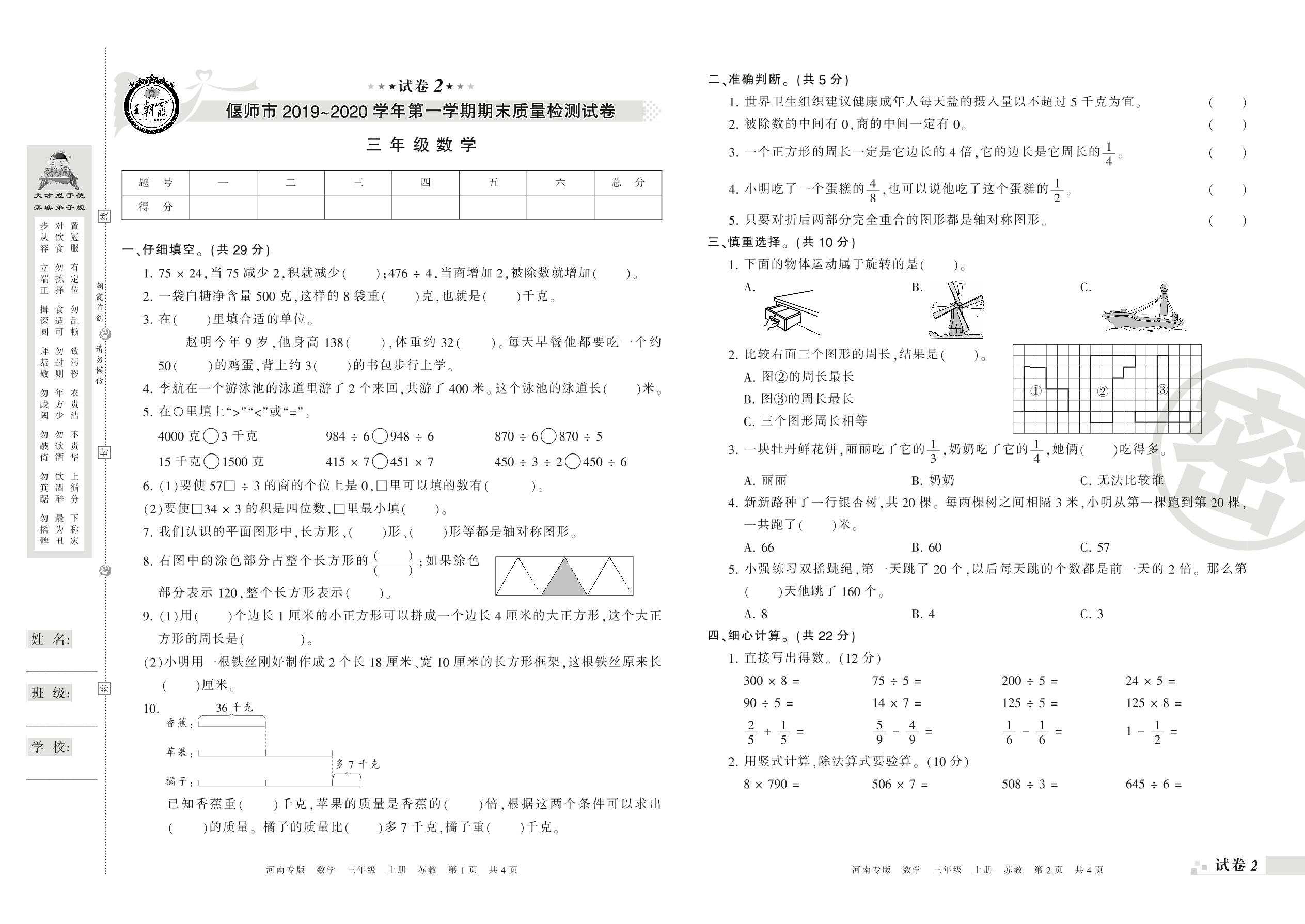 2019-2020学年第一学期偃师市三年级数学试卷(苏教版)【2】
