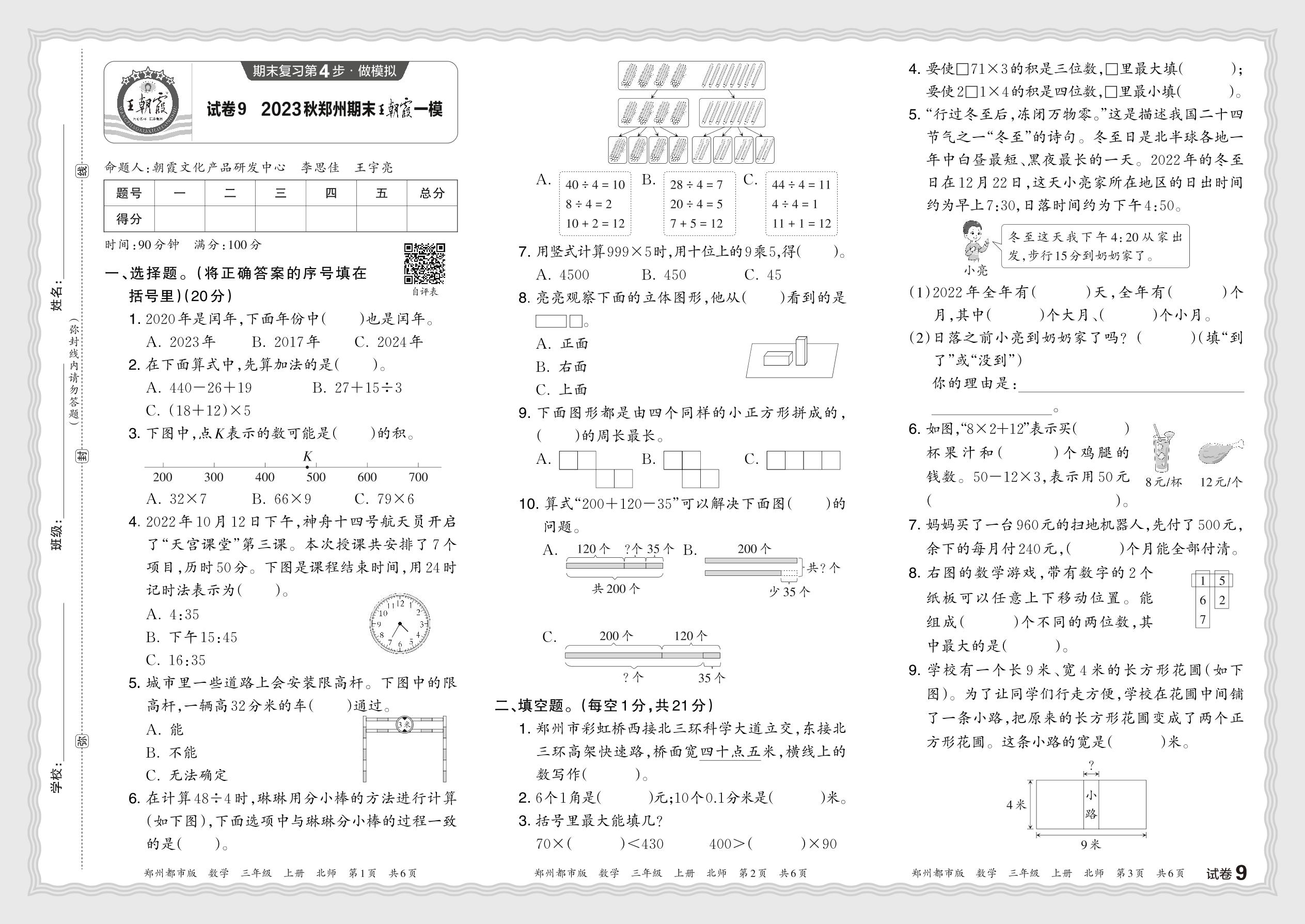 2023秋上册三年级数学北师版 河南郑州期末王朝霞一模【9】