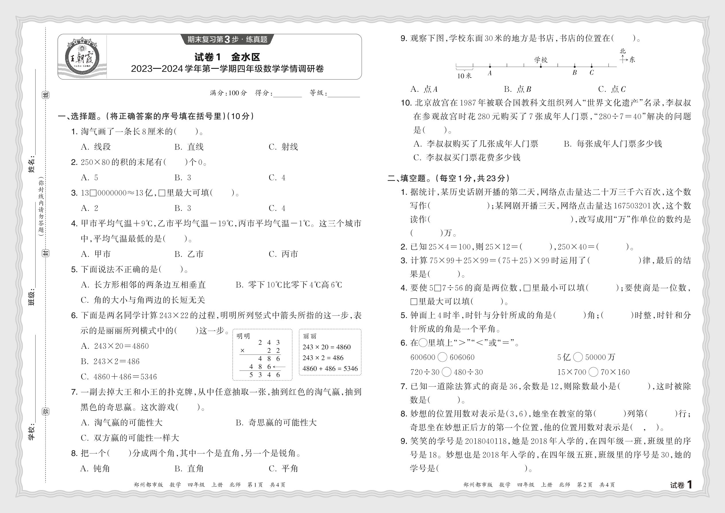 河南省郑州市金水区某重点小学2023—2024学年第一学期小学四年级数学学情调研卷【1】