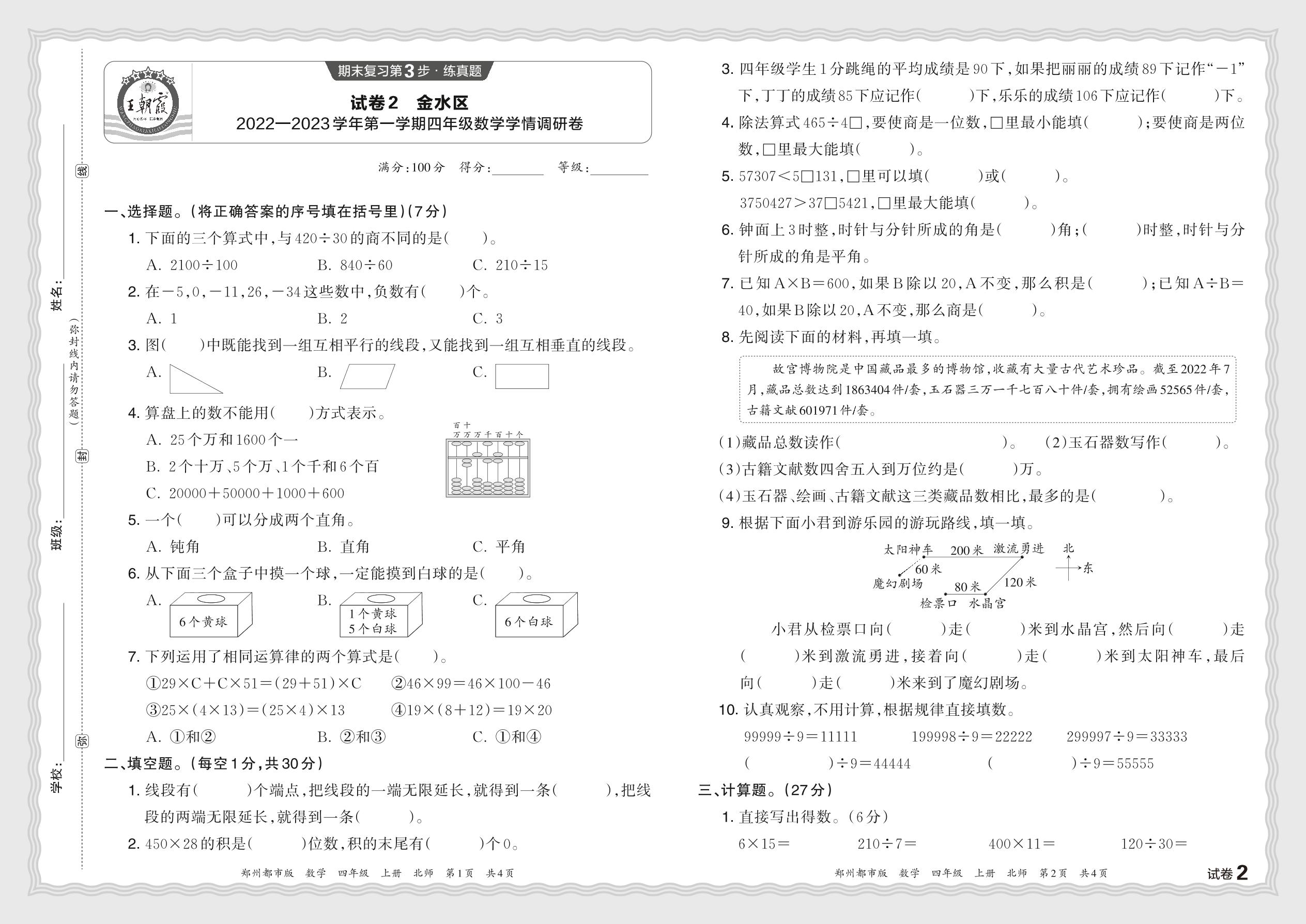 河南省郑州市金水区2022—2023学年第一学期四年级数学学情调研卷(北师版)【2】