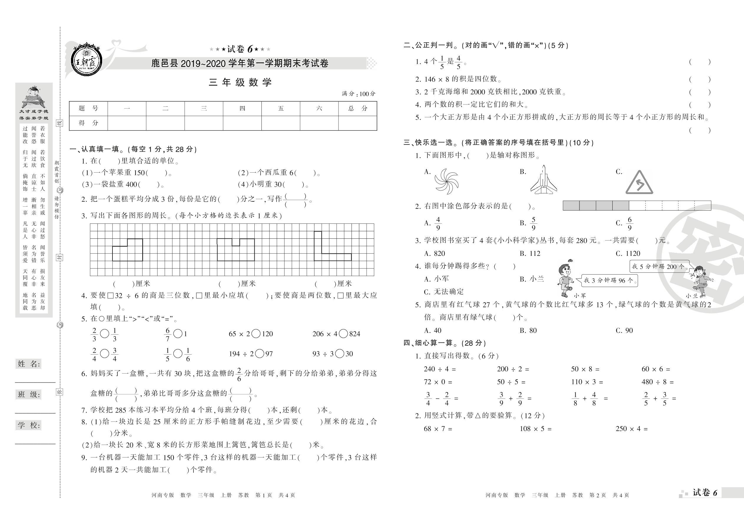 2019-2020学年第一学期周口市鹿邑县三年级数学试卷(苏教版)【6】