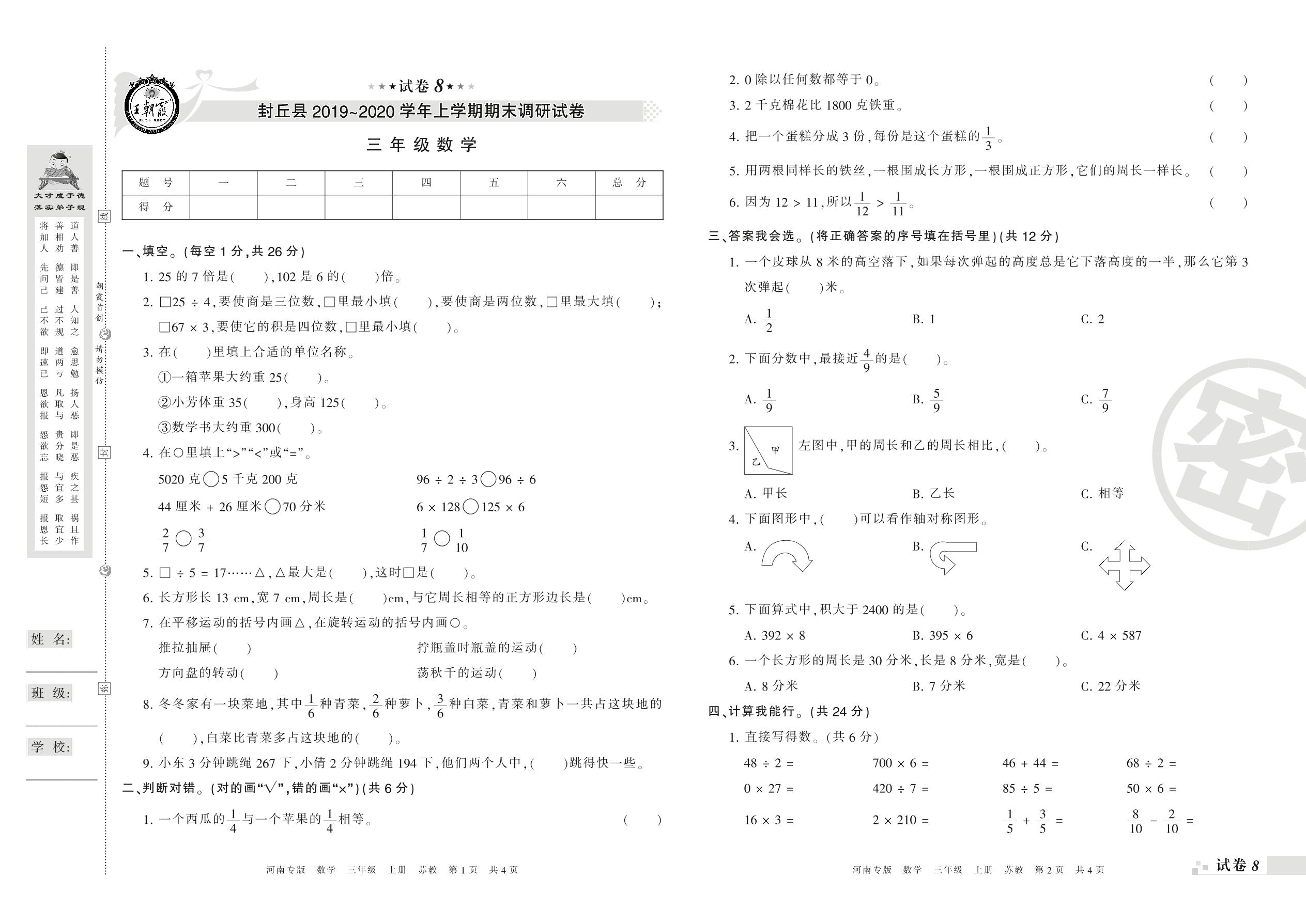 2019-2020学年第一学期新乡市封丘县三年级数学试卷(苏教版)【8】