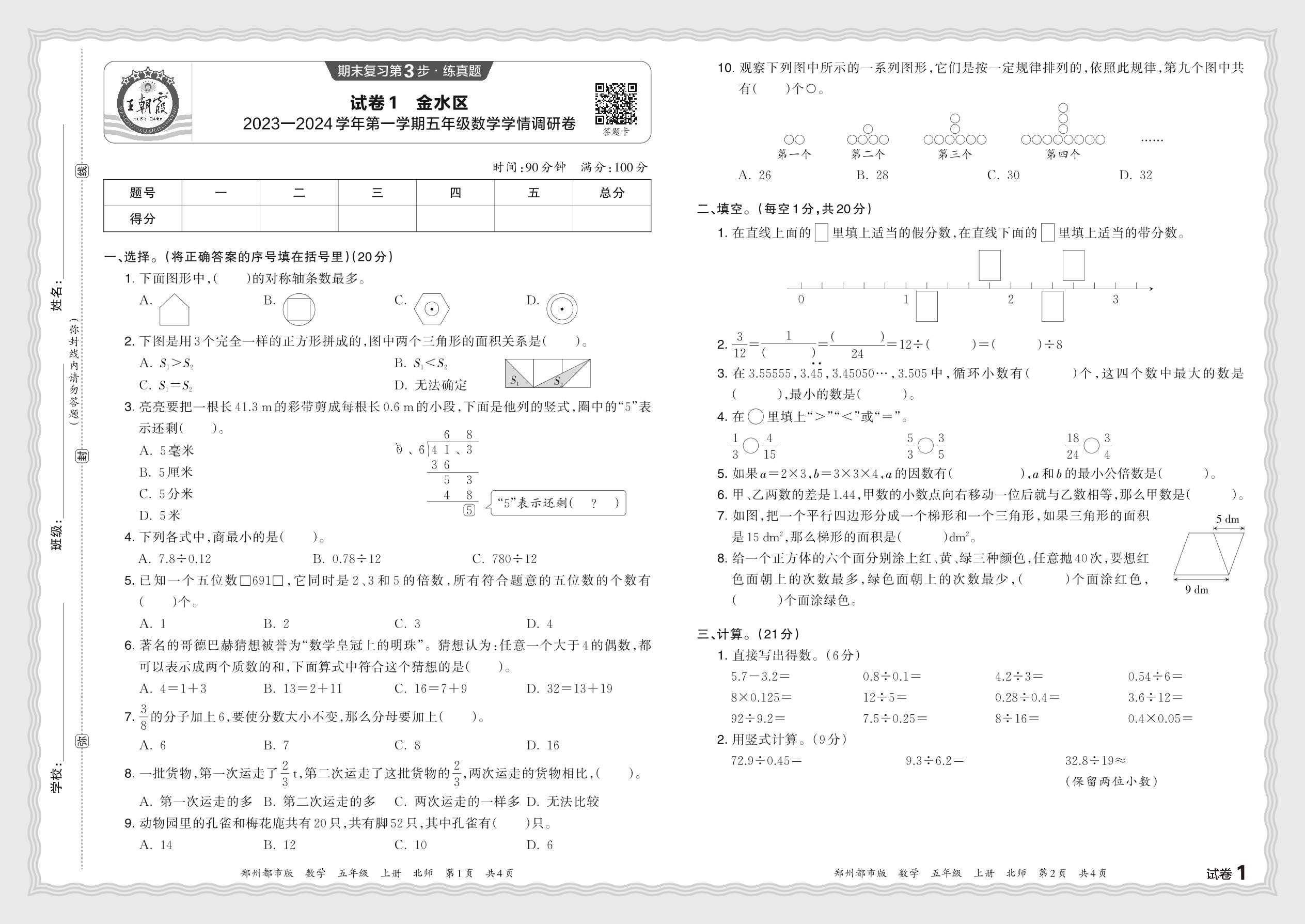 河南省郑州市金水区某重点小学2023—2024学年第一学期五年级数学学情调研卷(北师版)【1】
