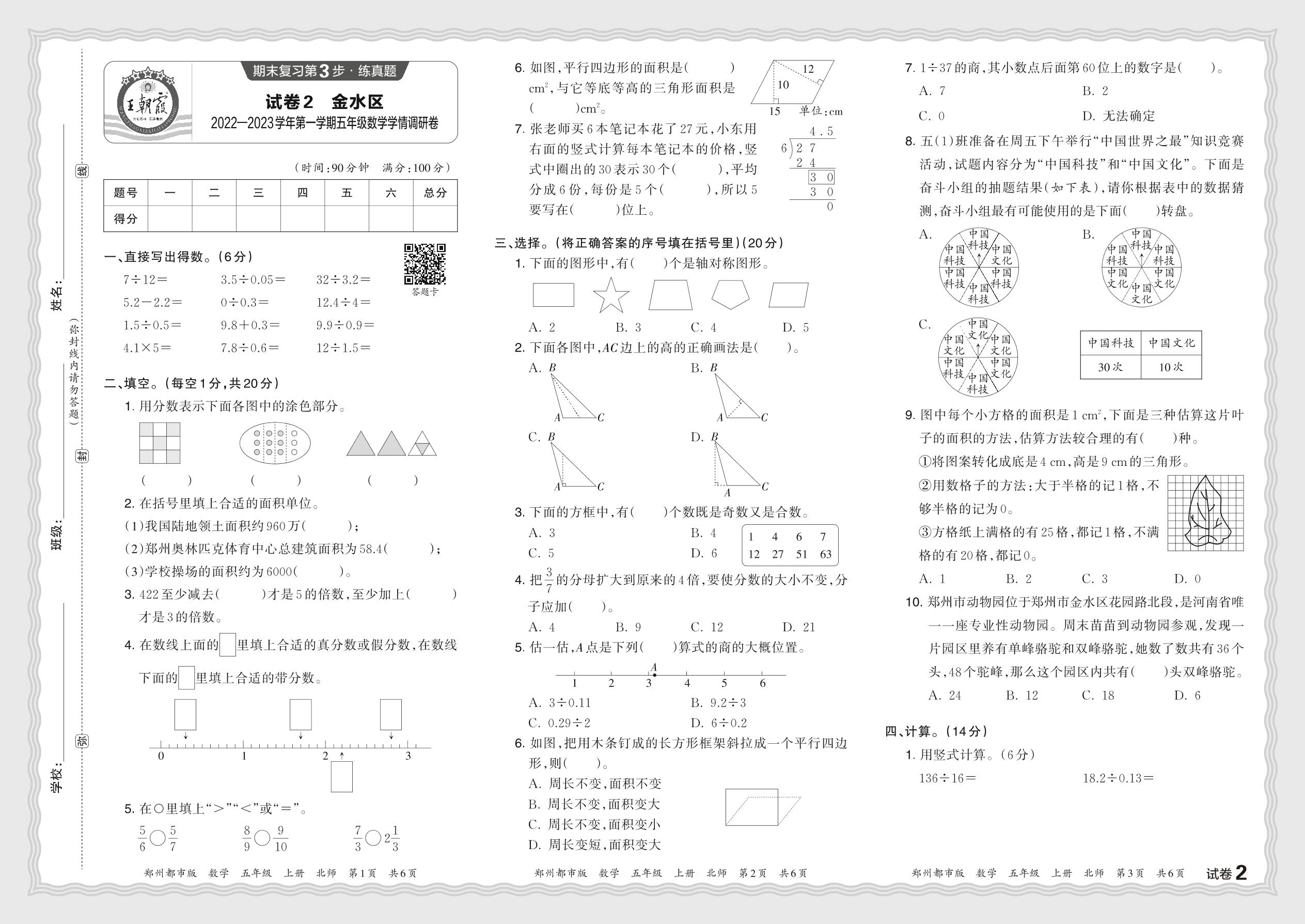 河南省郑州市金水区2022—2023学年第一学期五年级数学学情调研卷(北师版)【2】