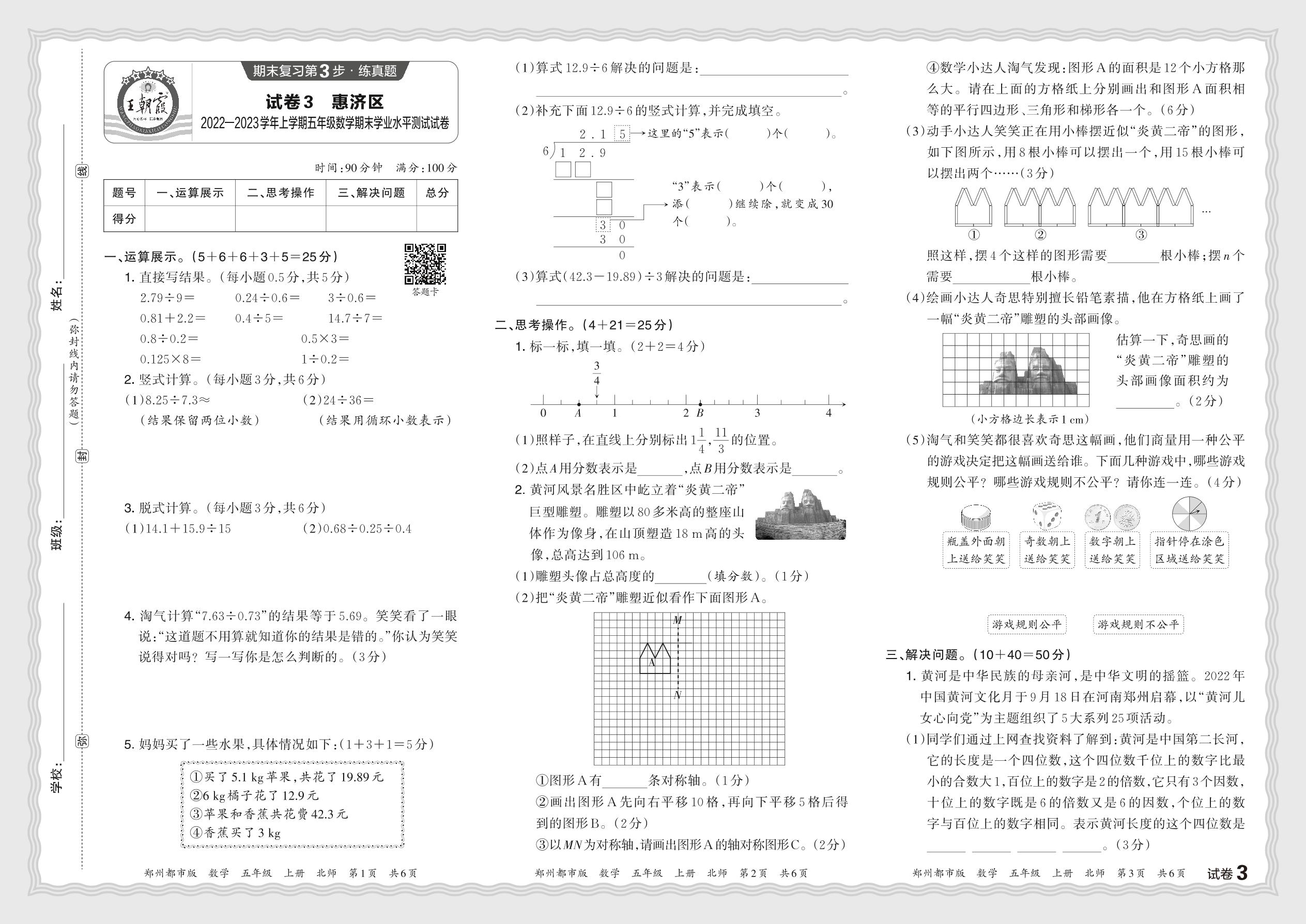 河南省郑州市惠济区2022—2023学年上学期五年级数学期末学业水平测试试卷(北师版)【3】