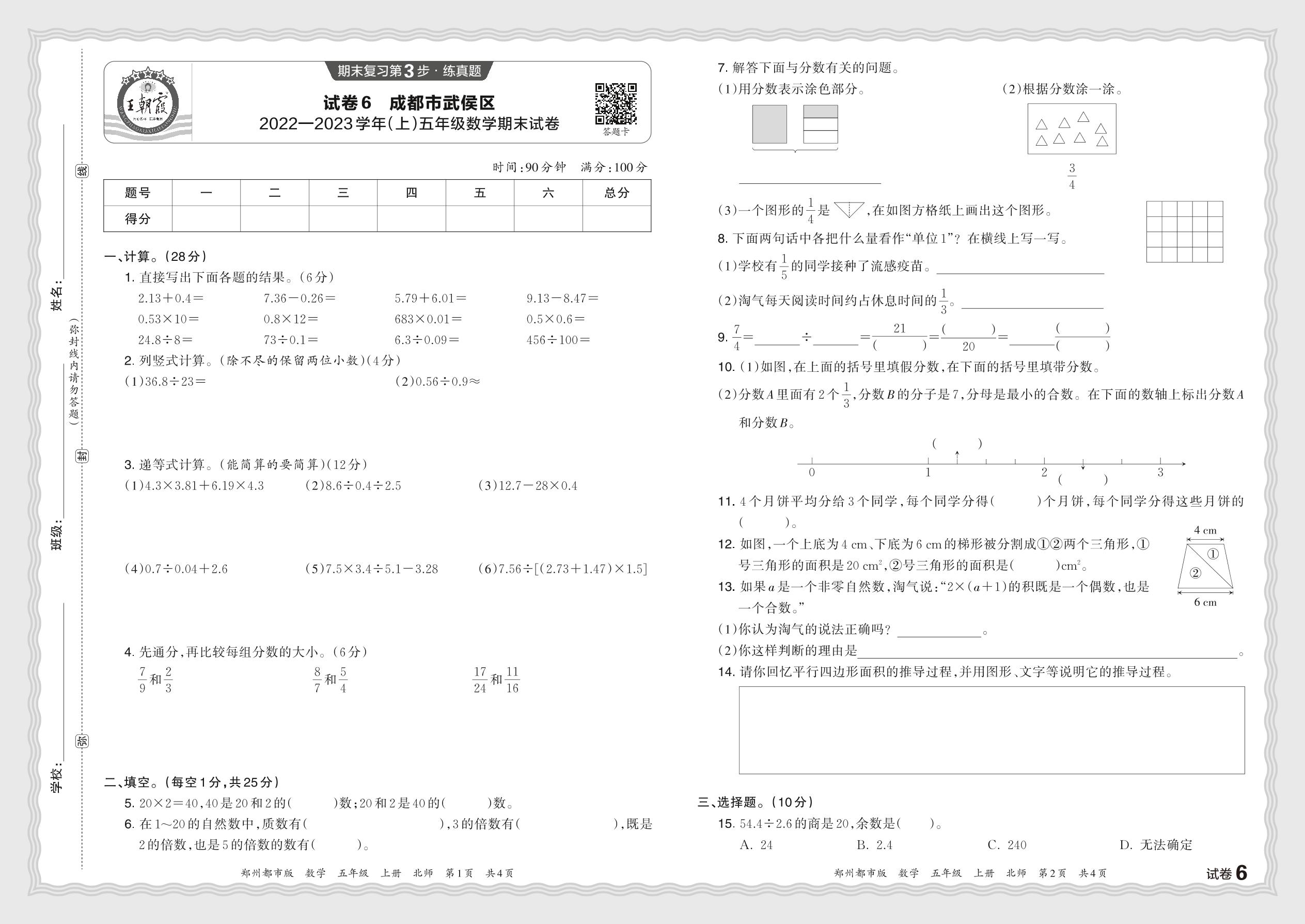 四川省成都市成华区2022—2023学年(上)五年级数学期末试卷(北师版)【6】