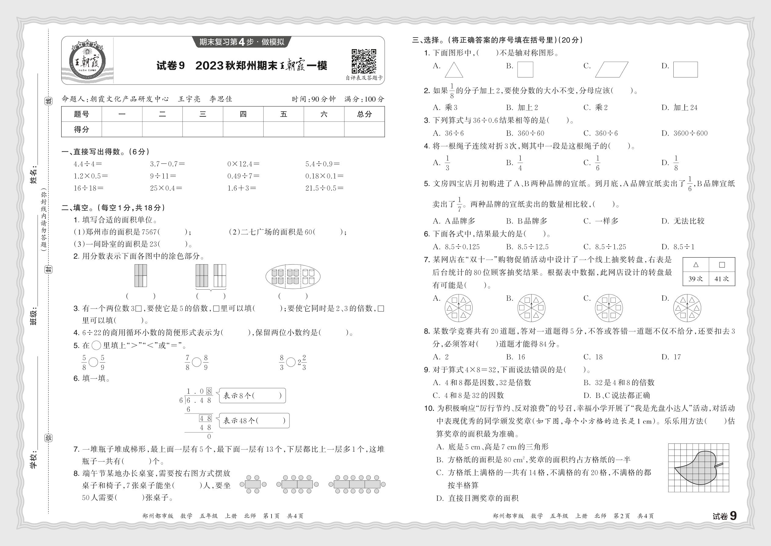 2023秋上册五年级数学北师版 河南郑州期末王朝霞一模【9】