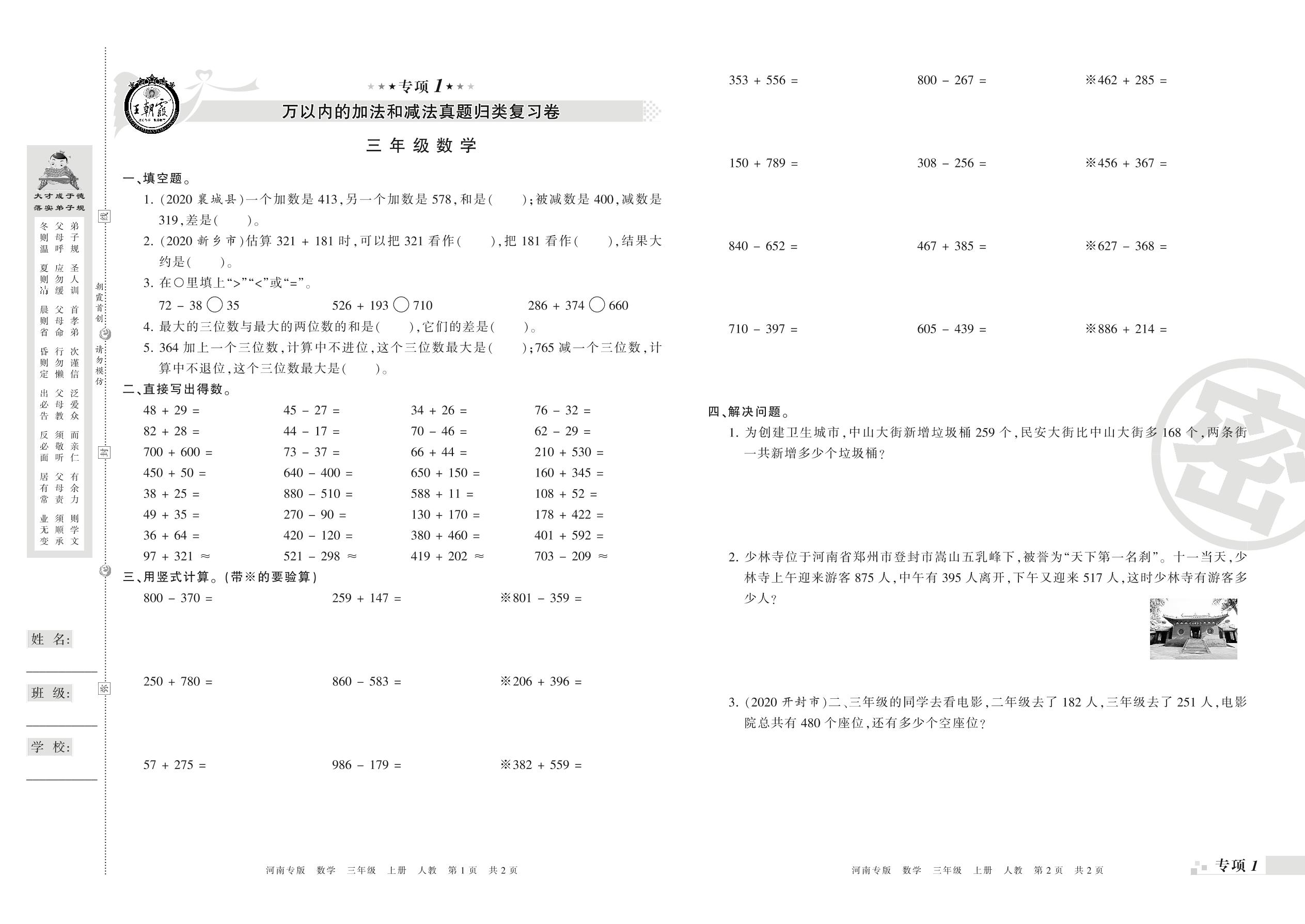 王朝霞期末专项卷——万以内的加法和减法、多位数乘一位数真题归类复习三年级上册数学(人教版)【0】