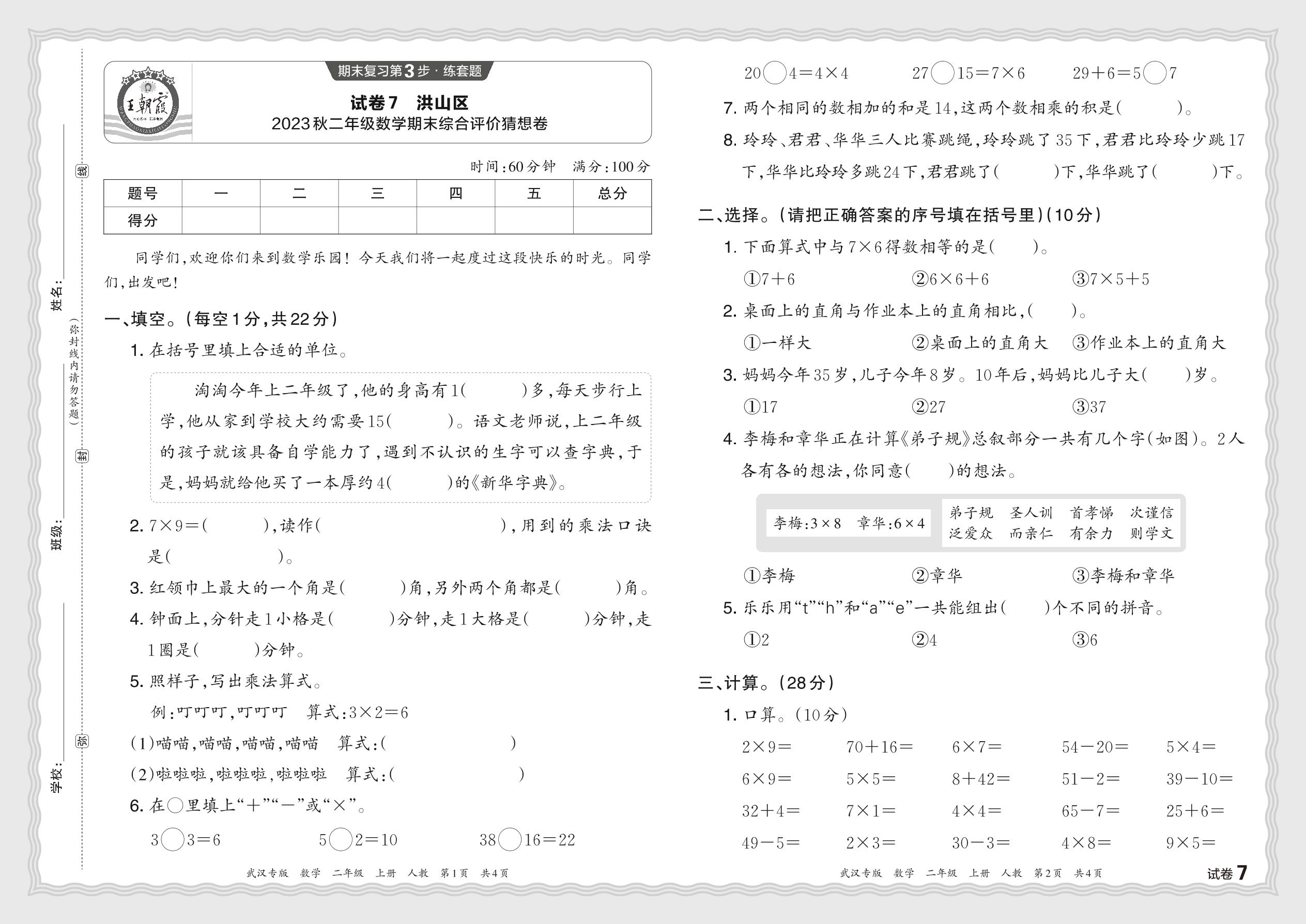 湖北省武汉市洪山区2023秋二年级数学期末综合评价猜想卷(人教版)【7】