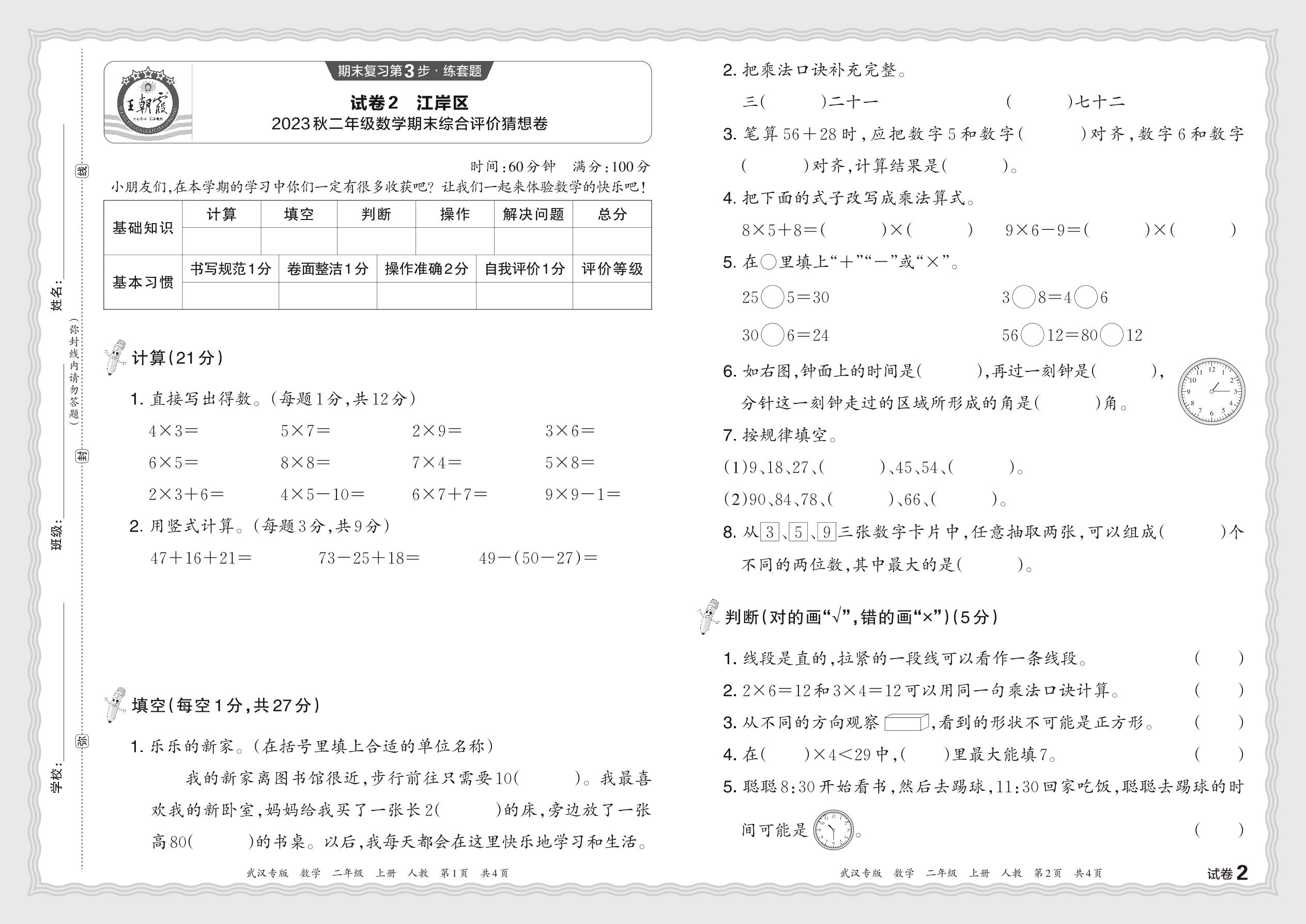 湖北省武汉市江岸区2023秋二年级数学期末综合评价猜想卷(人教版)【2】