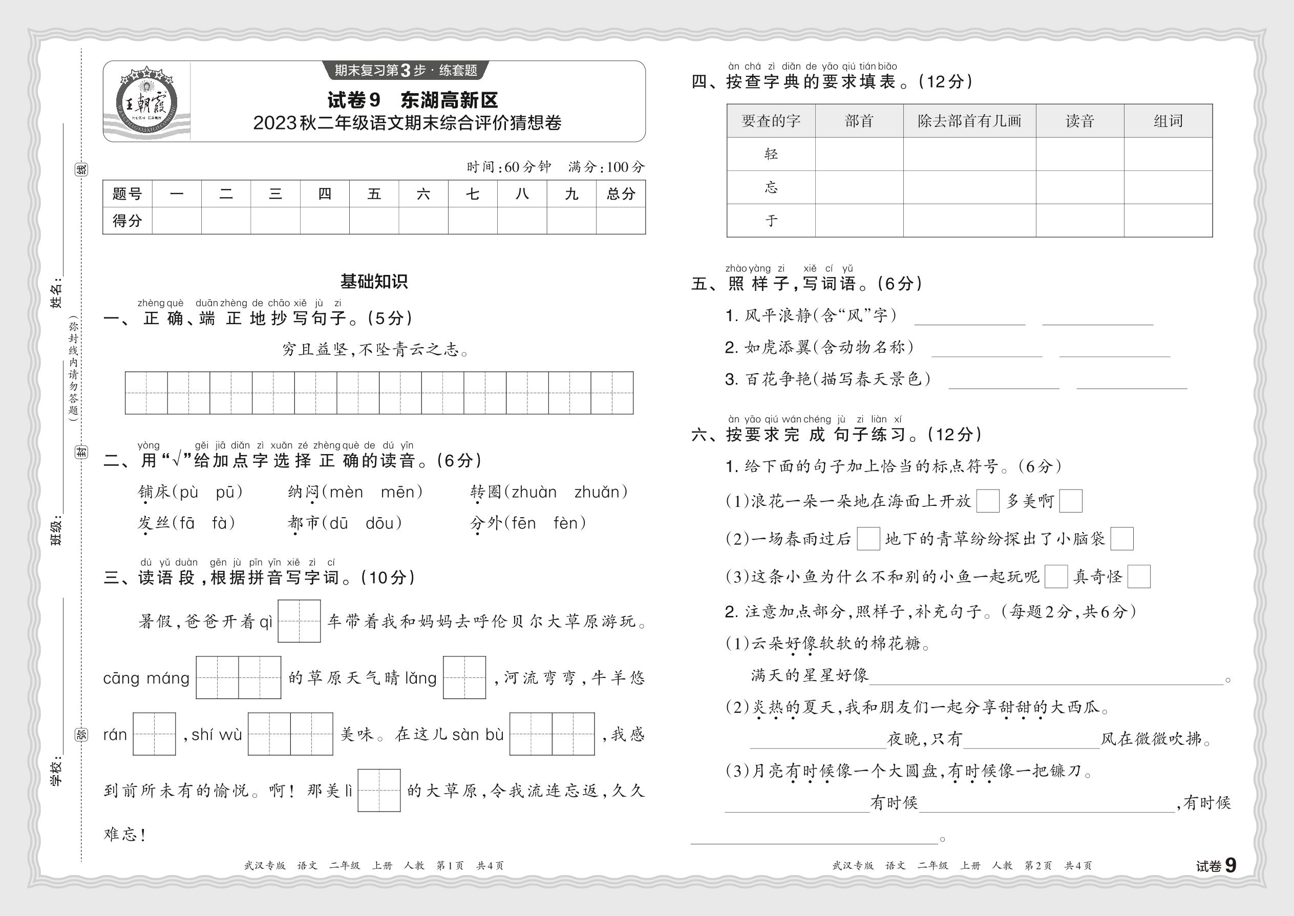 湖北省武汉市东湖高新区2023秋二年级语文期末综合评价猜想卷(人教版)【9】
