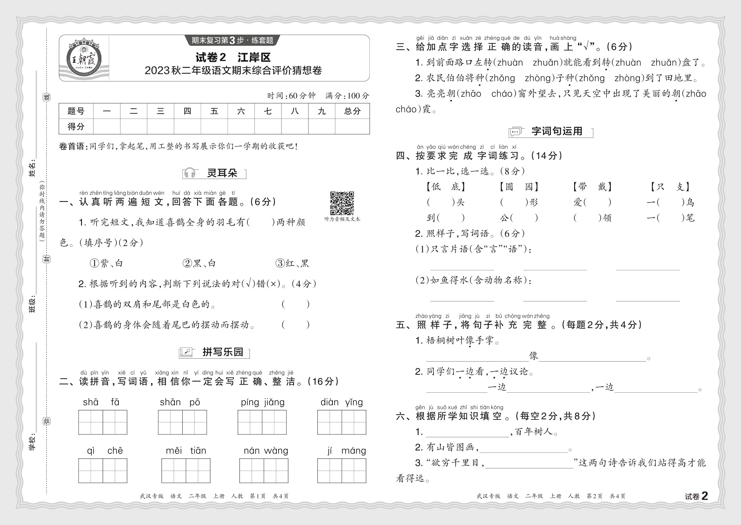 湖北省武汉市江岸区2023秋二年级语文期末综合评价猜想卷(人教版)【2】