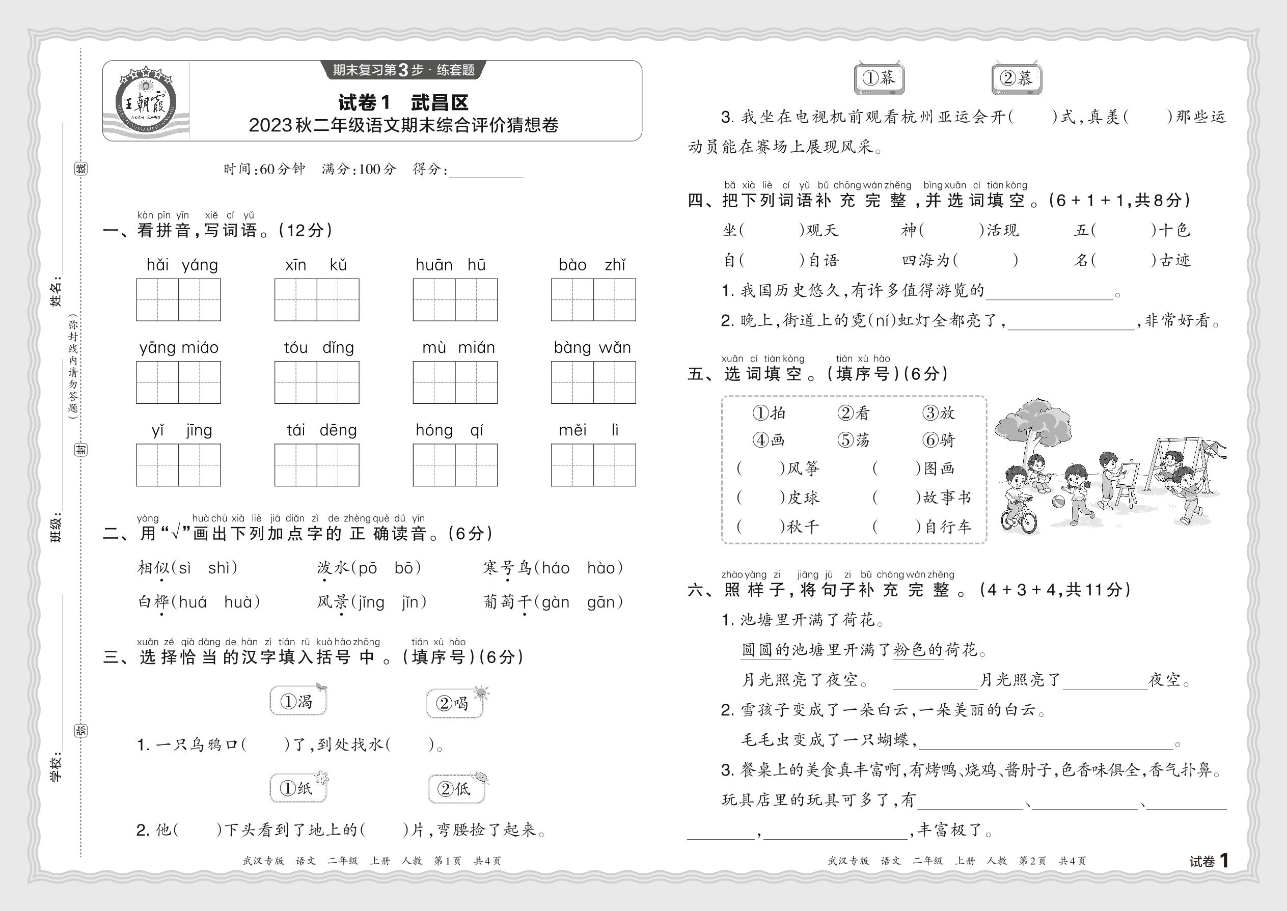 湖北省武汉市武昌区2023秋二年级语文期末综合评价猜想卷(人教版)【1】