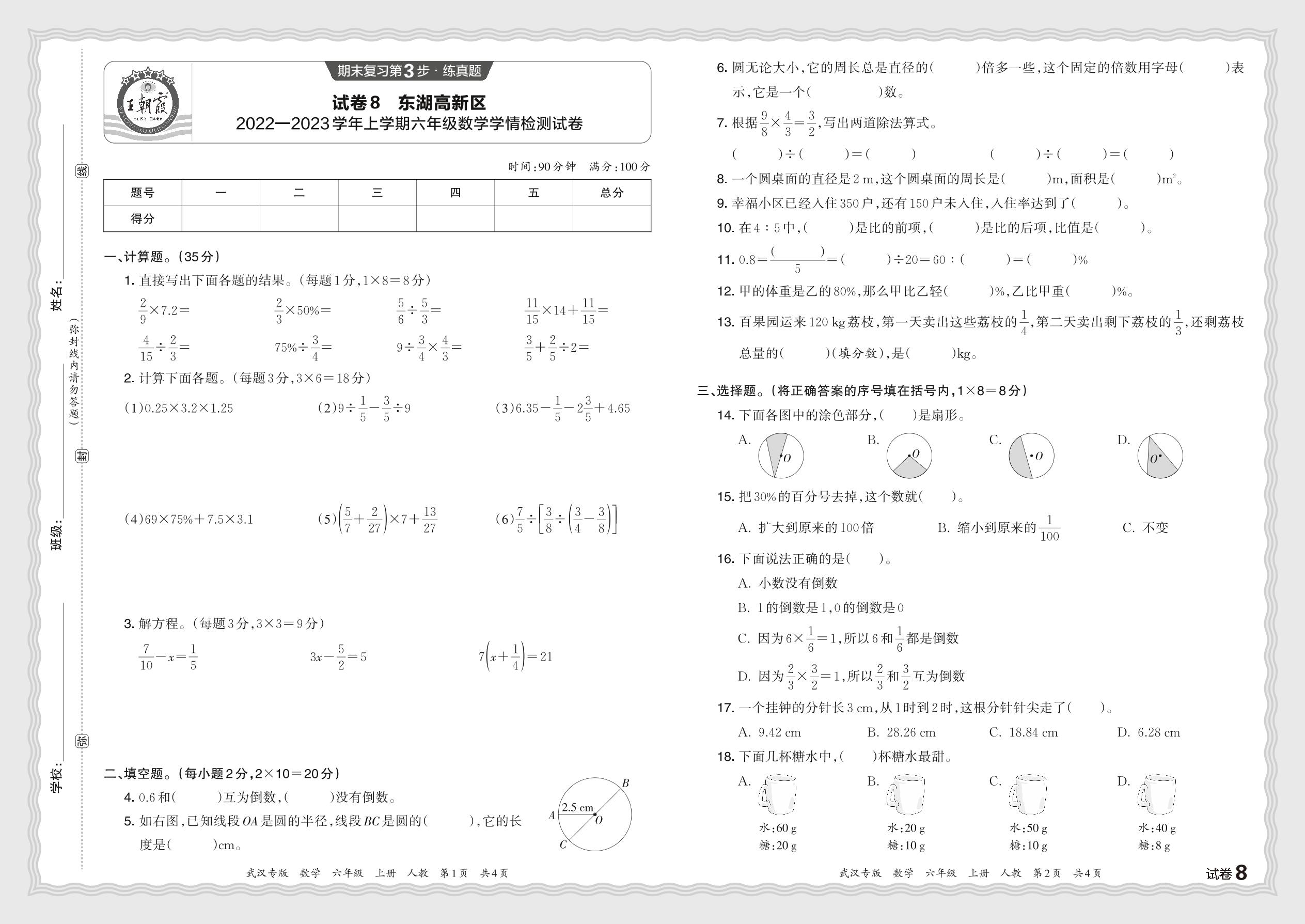 湖北省武汉市东湖高新区2022—2023学年上学期六年级数学学情检测试卷(人教版)【8】