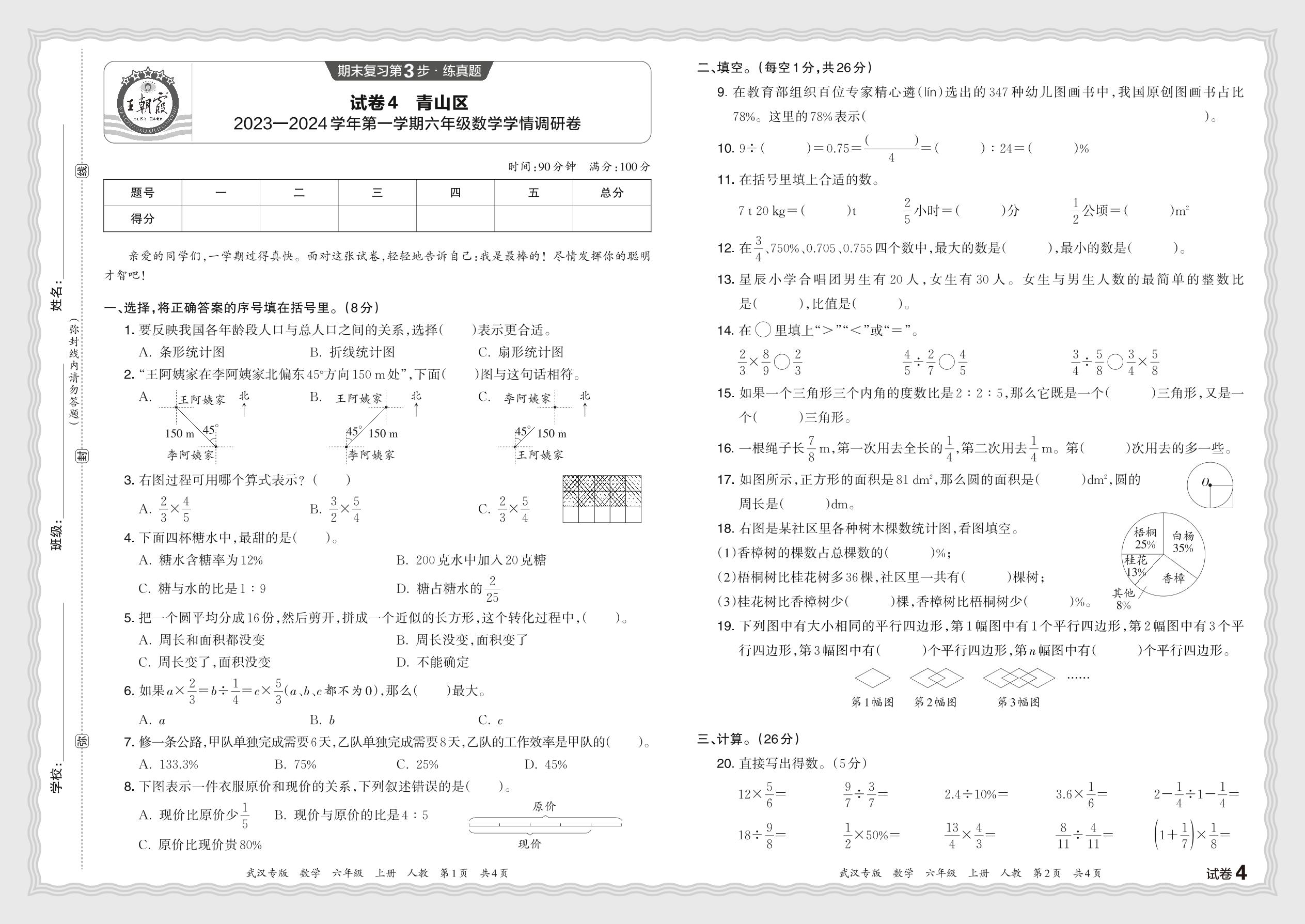 湖北省武汉市青山区2023—2024学年第一学期六年级数学学情调研卷(人教版)【4】