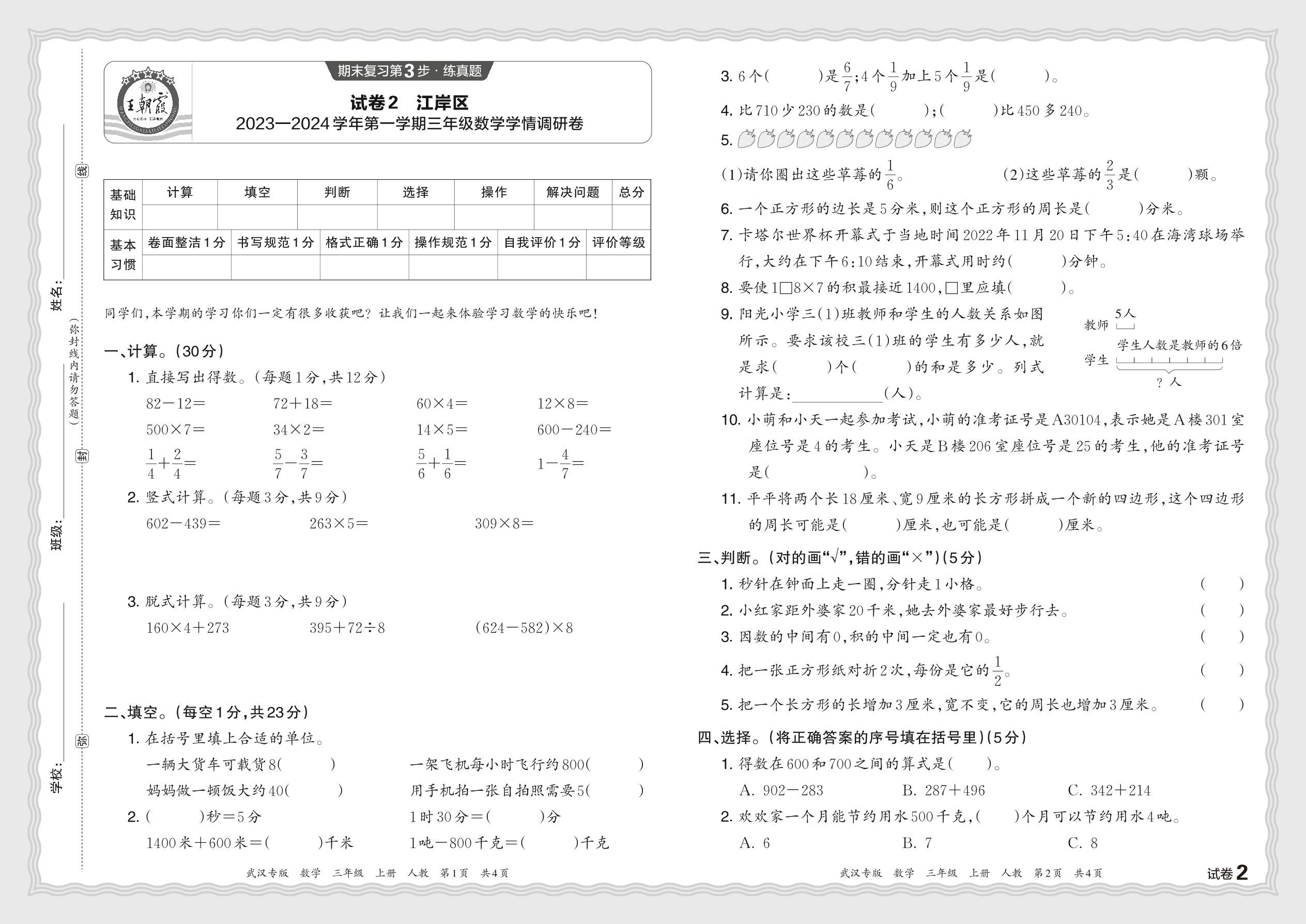湖北省武汉市江岸区2023—2024学年第一学期三年级数学学情调研卷(人教版)【2】