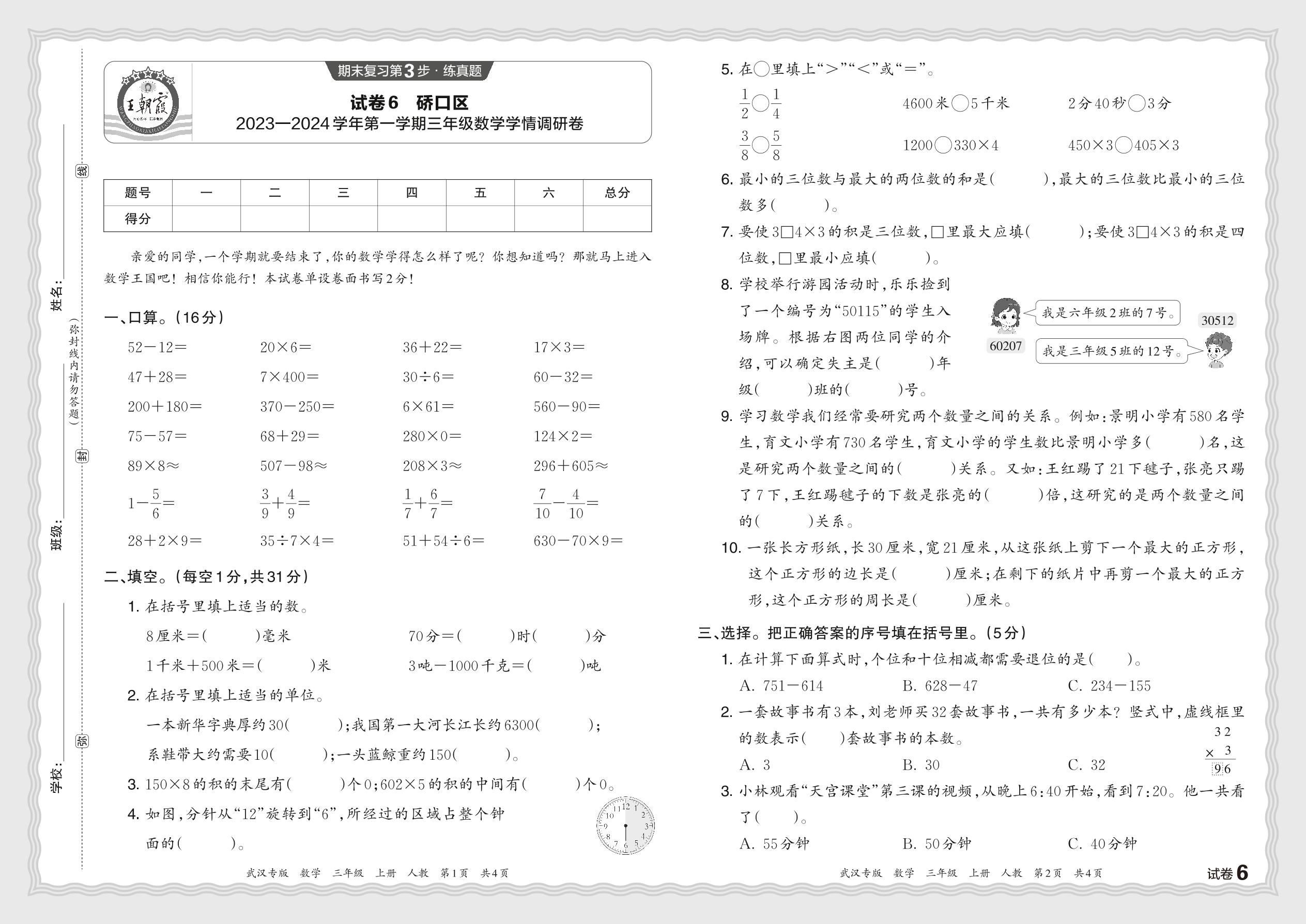 湖北省武汉市硚口区2023—2024学年第一学期三年级数学学情调研卷(人教版)【6】