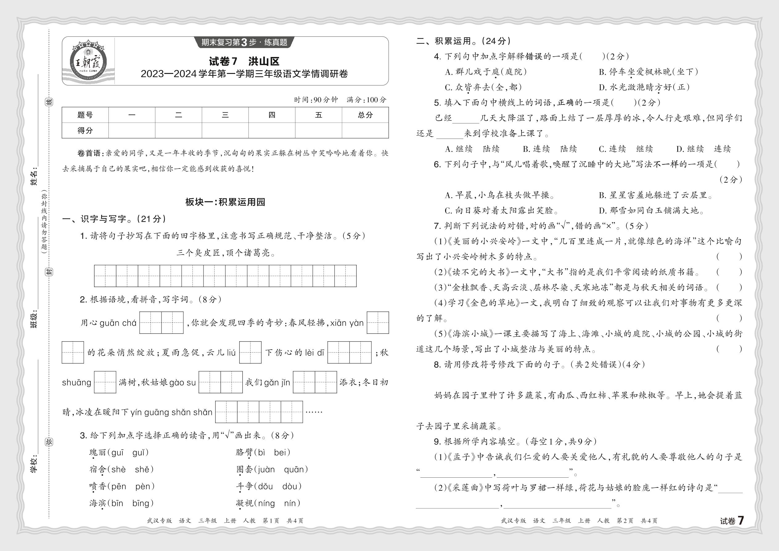 湖北省武汉市洪山区2023—2024学年第一学期三年级语文学情调研卷(人教版)【7】