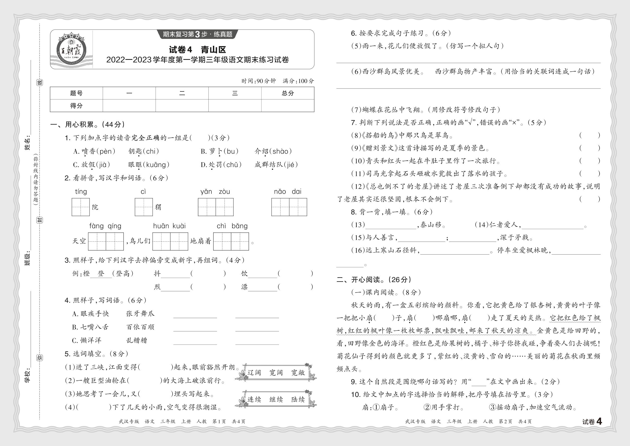 湖北省武汉市青山区2022—2023学年度第一学期三年级语文期末练习试卷(人教版)【4】