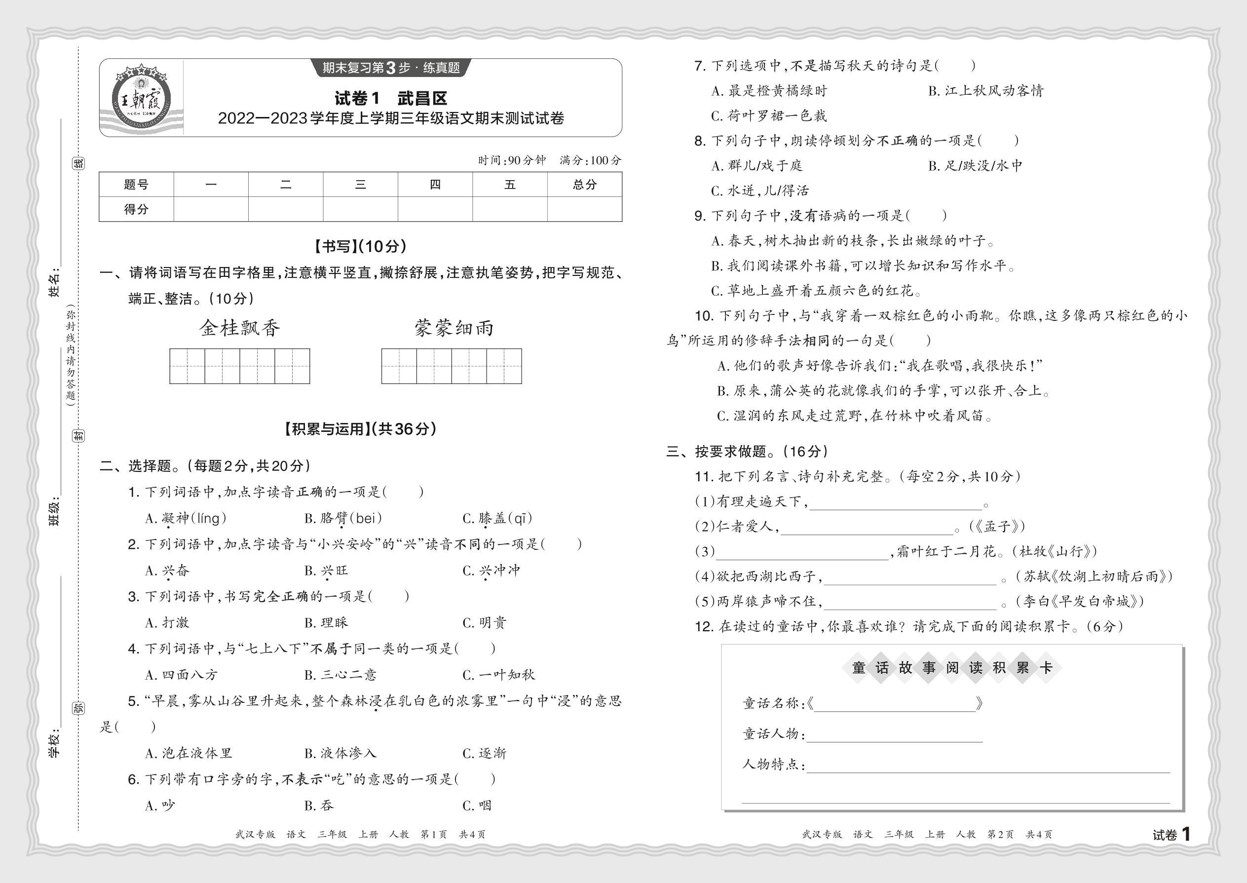 湖北省武汉市武昌区2022—2023学年度上学期三年级语文期末测试试卷(人教版)【1】