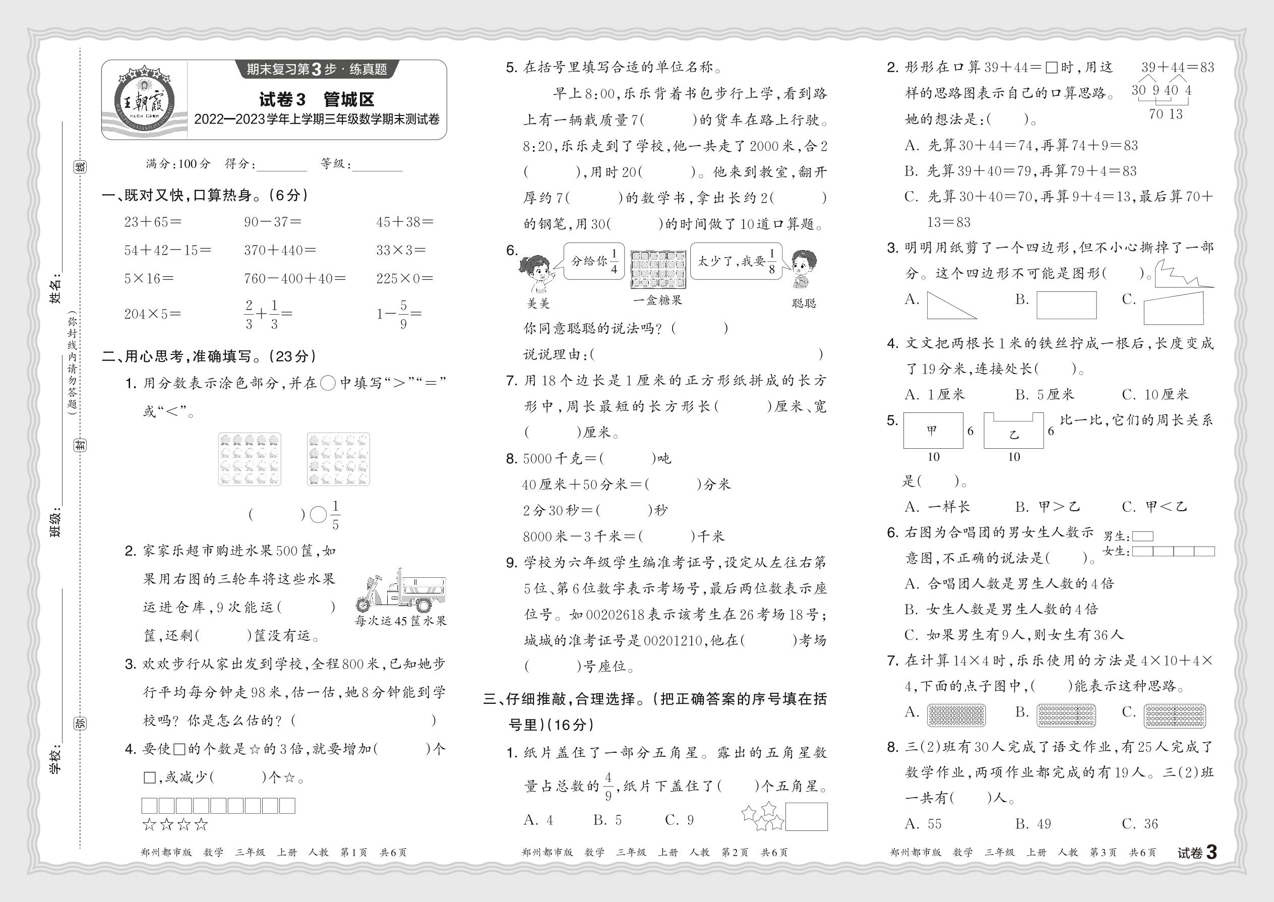 河南省郑州市管城区2022—2023学年上学期三年级数学期末测试卷(人教版)【3】