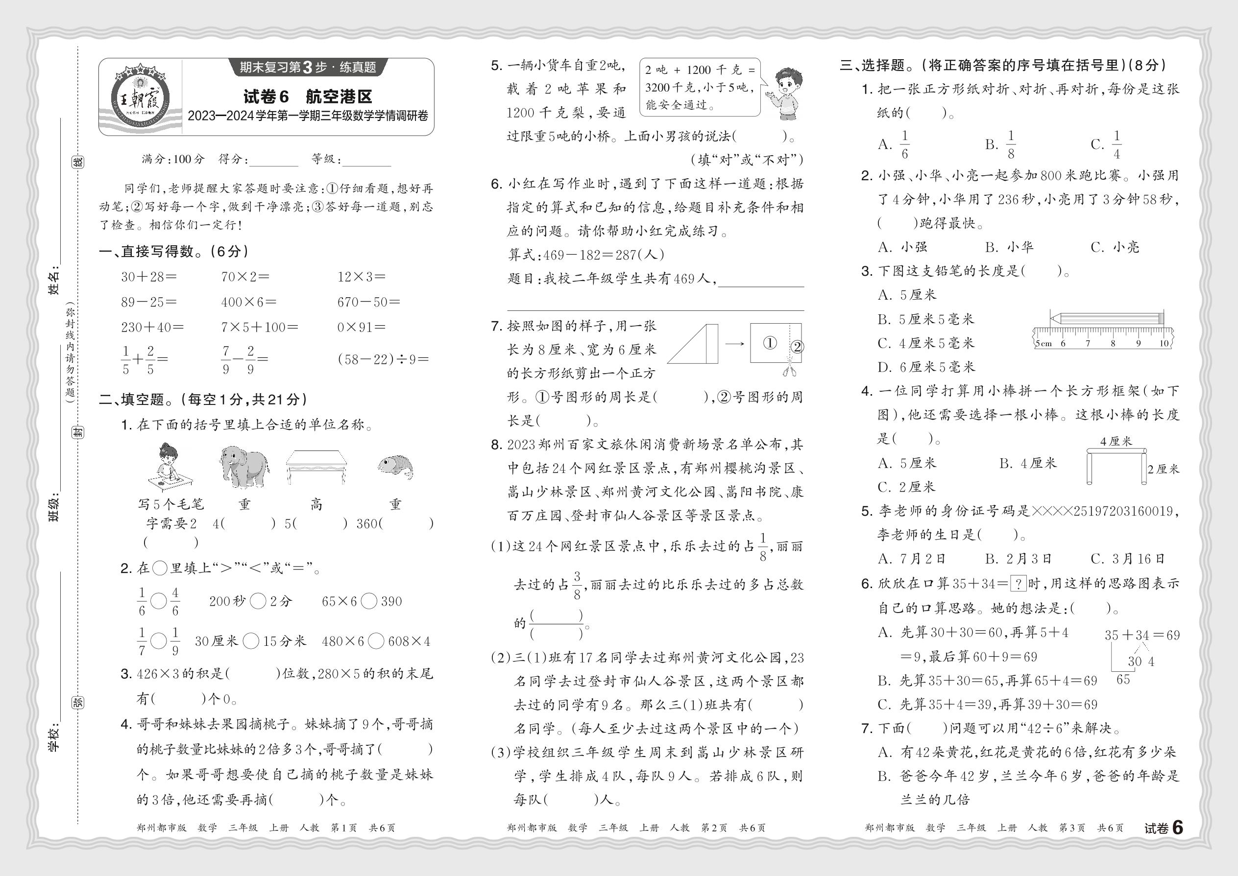 河南省郑州市航空港区2023—2024学年第一学期三年级数学学情调研卷(人教版)【6】