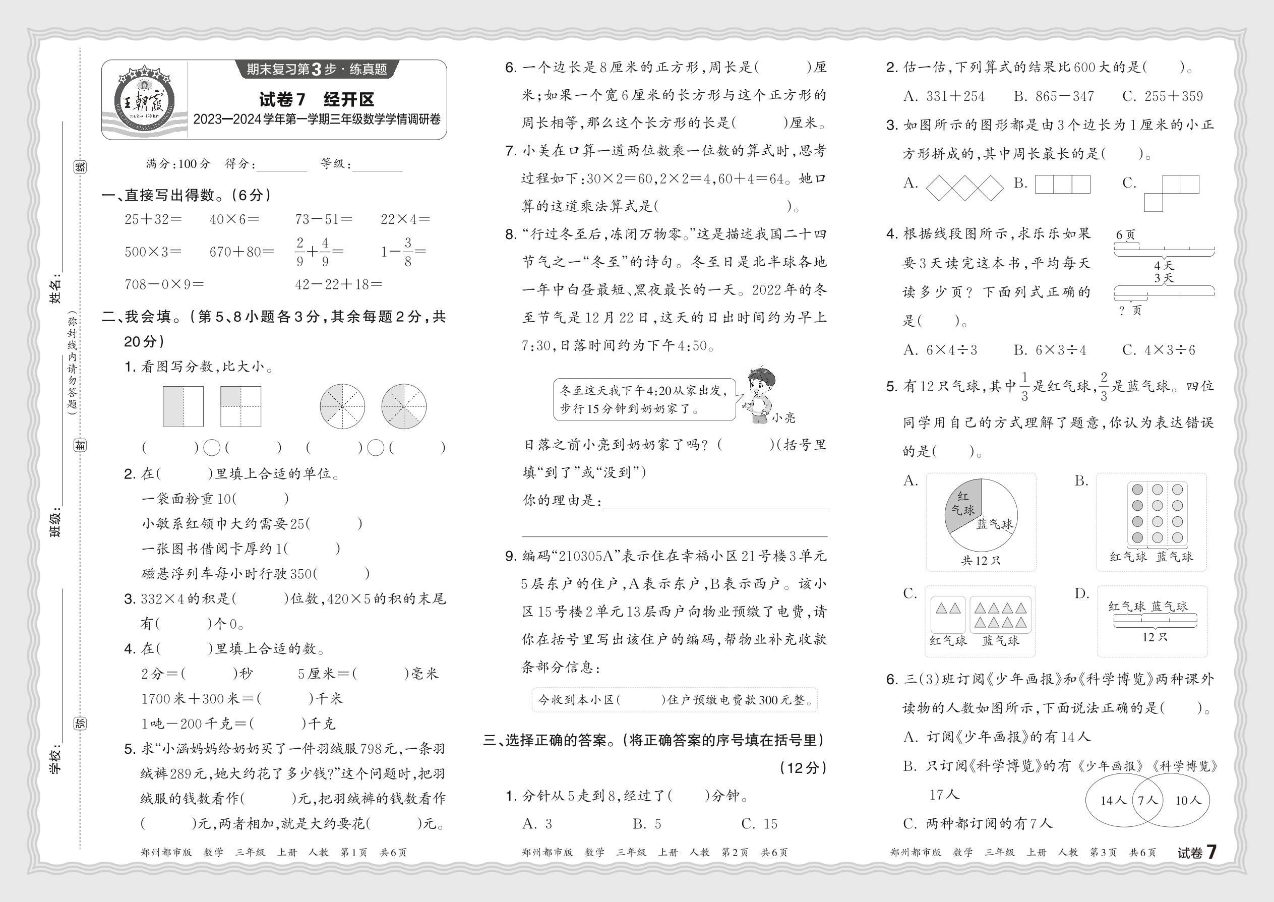 河南省郑州市经开区2023—2024学年第一学期三年级数学学情调研卷(人教版)【7】