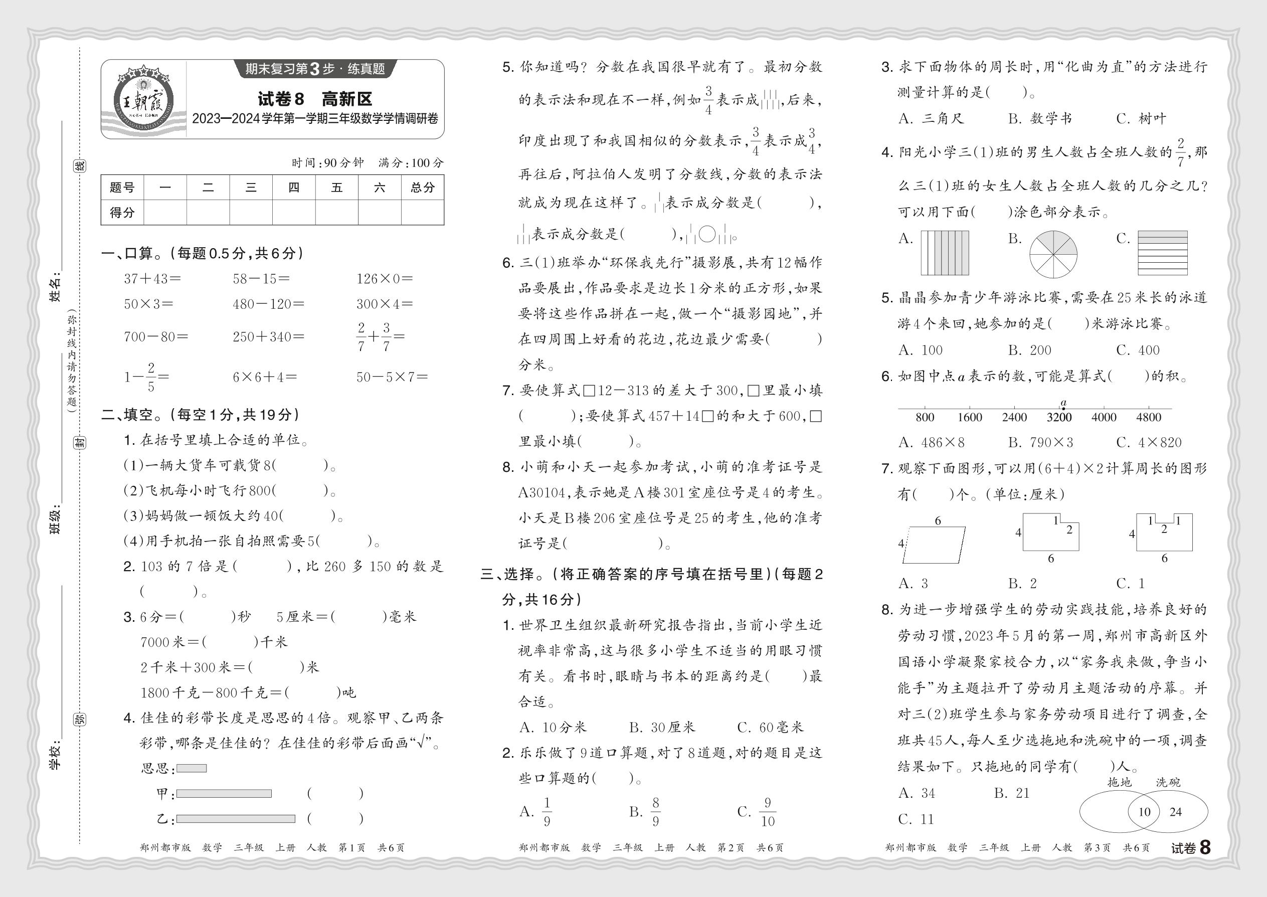 河南省郑州市高新区2023—2024学年第一学期三年级数学学情调研卷(人教版)【8】