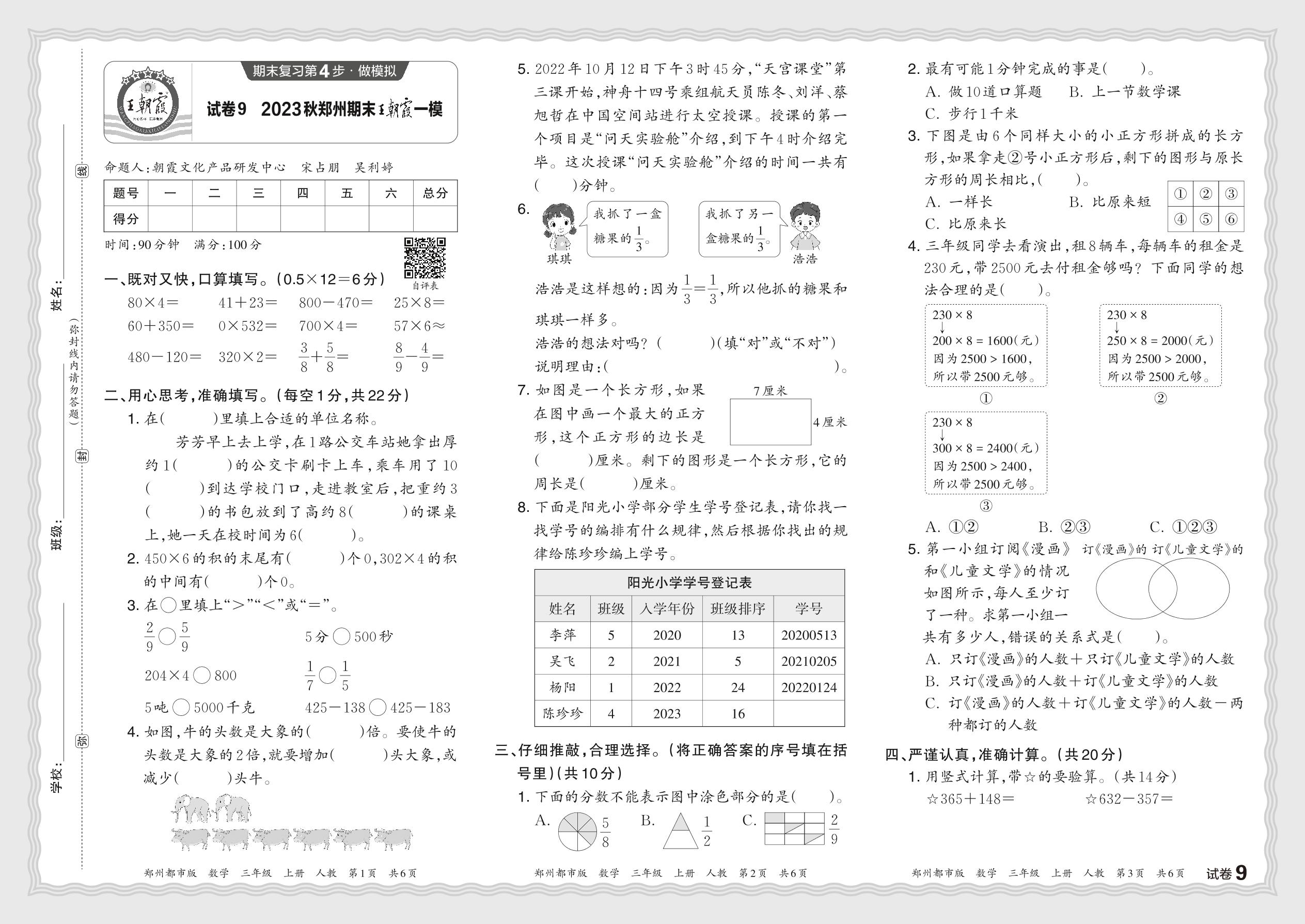 2023秋上册三年级数学人教版 河南郑州期末王朝霞一模【9】
