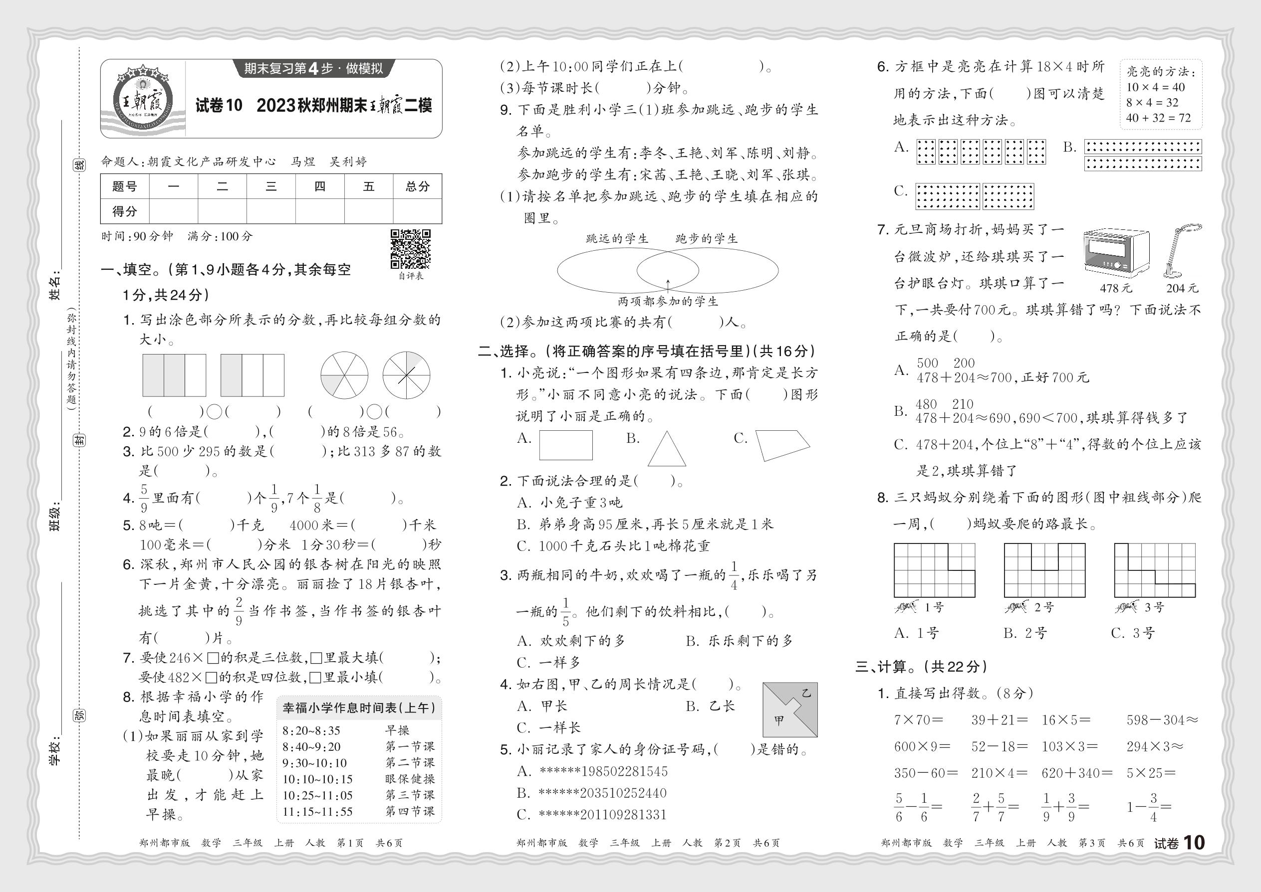 2023秋上册三年级数学人教版 河南郑州期末王朝霞二模【10】