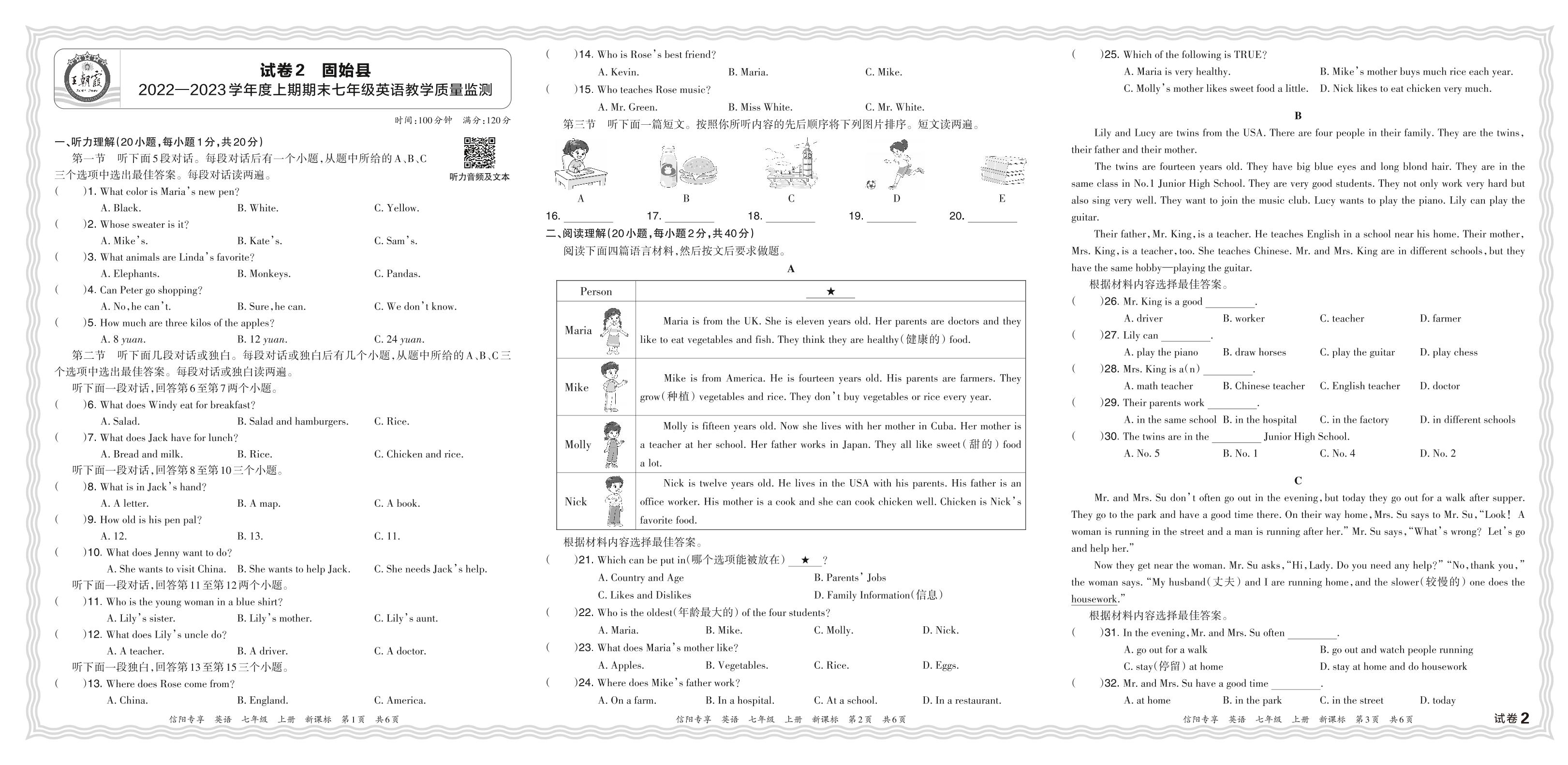 河南省信阳市固始县2022—2023学年度上期期末七年级英语教学质量监测(新课标版)【2】