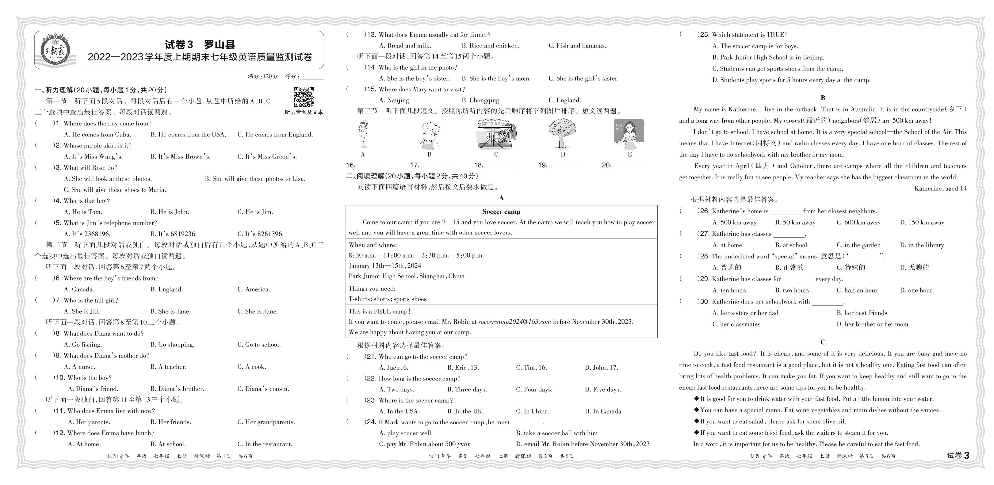 河南省信阳市罗山县2022—2023学年度上期期末七年级英语质量监测试卷(新课标版)【3】