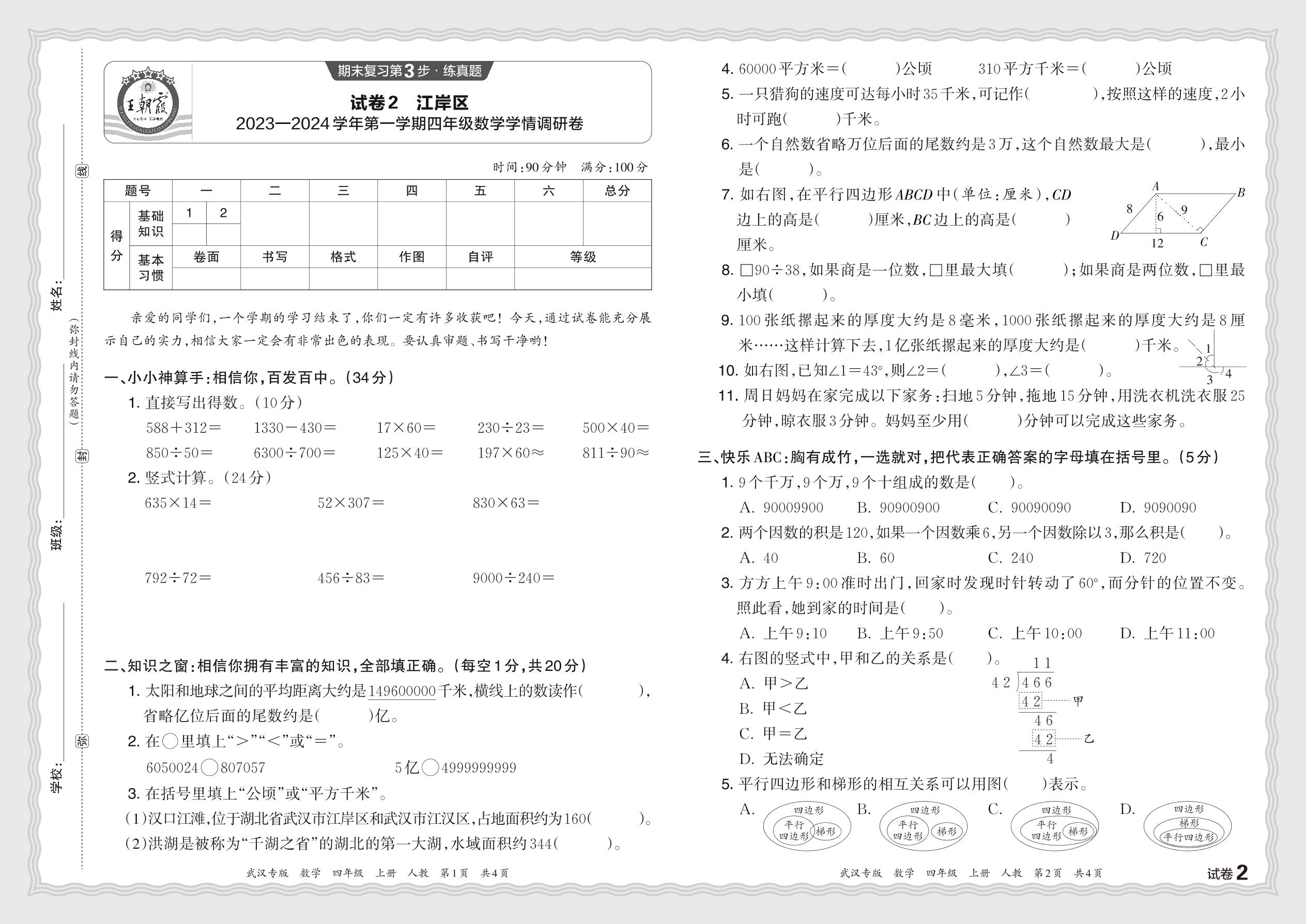湖北省武汉市江岸区2023—2024学年第一学期四年级数学学情调研卷(人教版)【2】