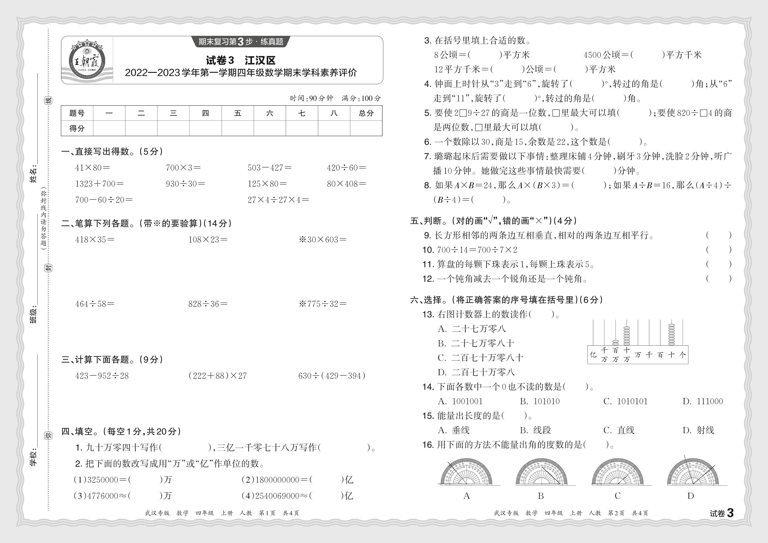 湖北省武汉市江汉区2022—2023学年第一学期四年级数学期末学科素养评价(人教版)【3】