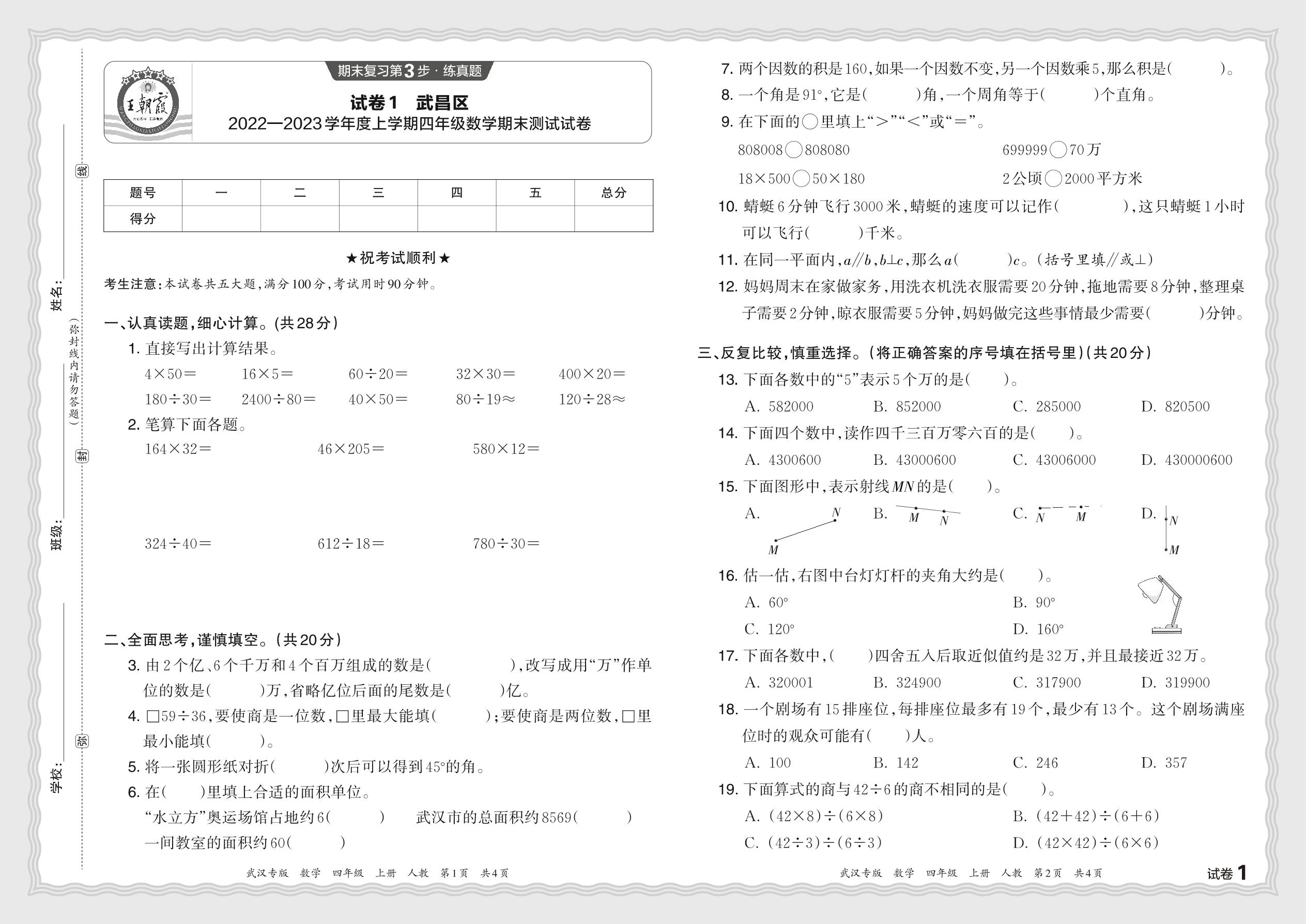 湖北省武汉市武昌区2022—2023学年度上学期四年级数学期末测试试卷(人教版)【1】
